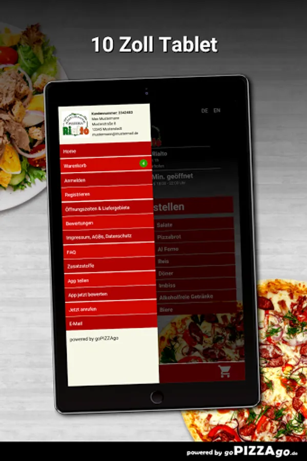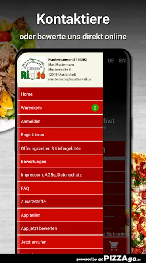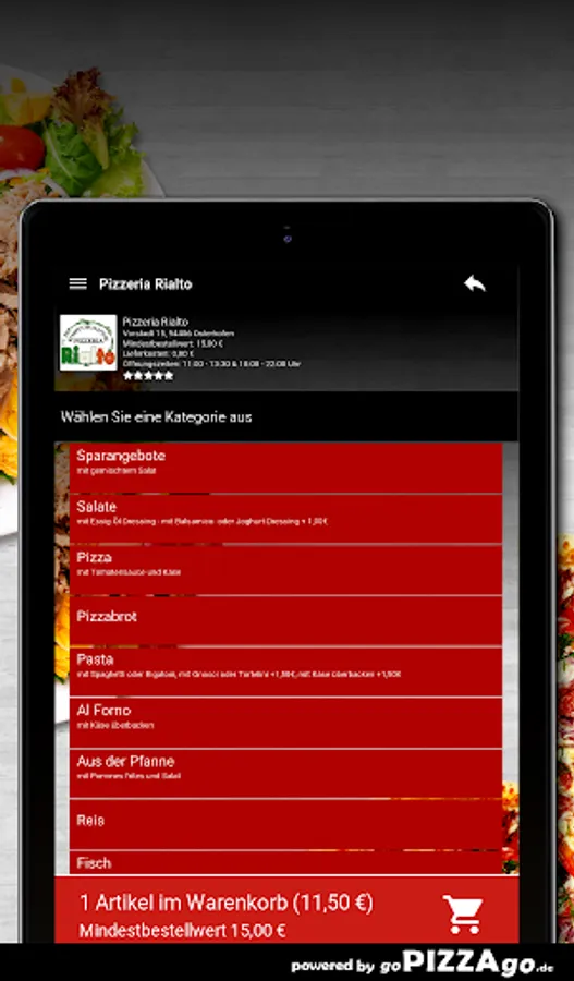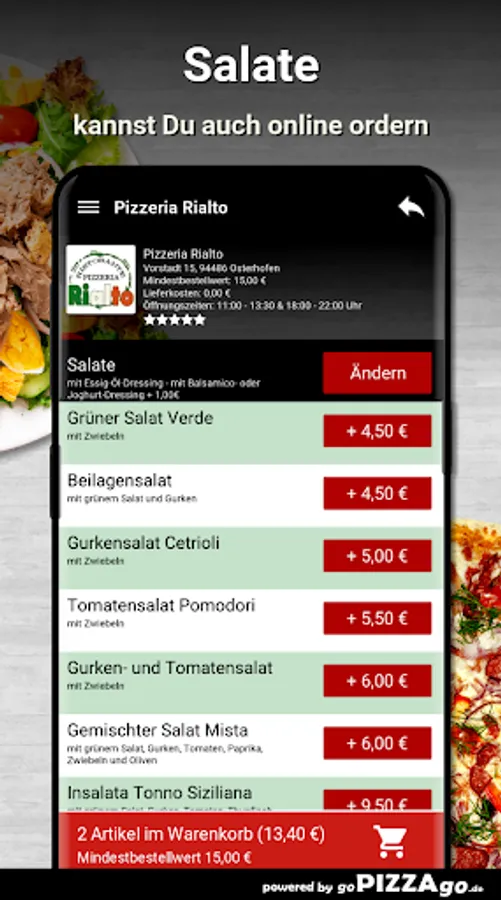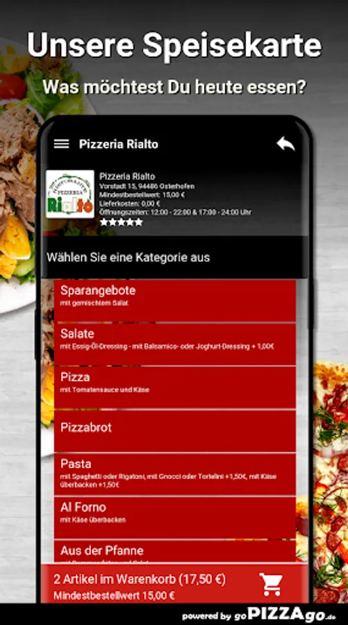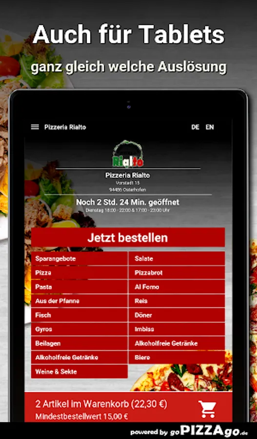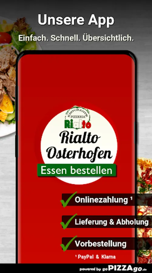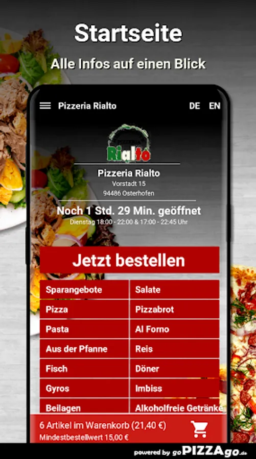 You can order and pay for food, freshly prepared and delivered hot, from the delivery service Pizzeria Rialto (94486 Osterhofen). You will find 146 fresh dishes in our online menu. Our popular items are When we deliver your food