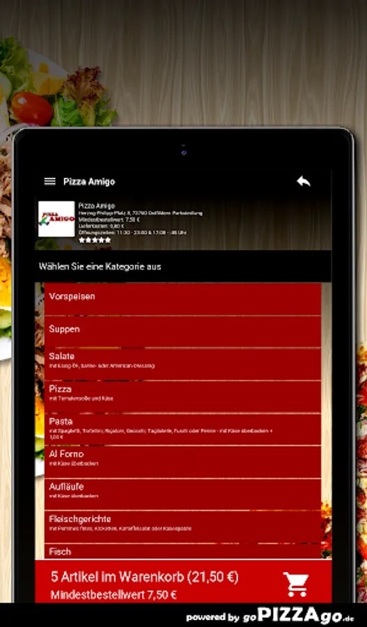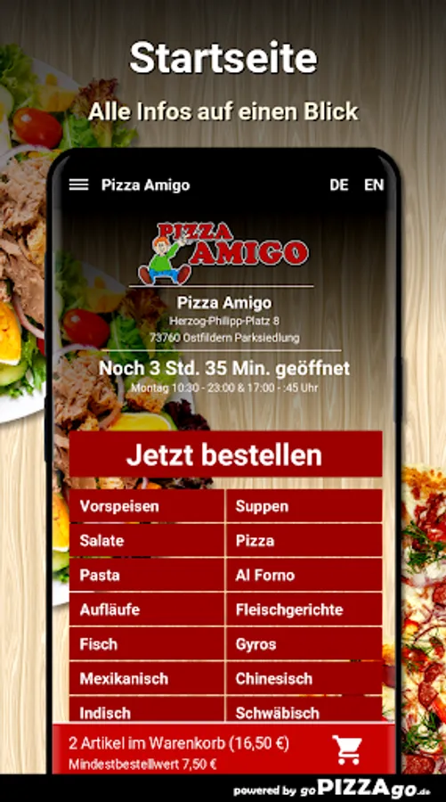 Which delicious pizzas do you get at Bringdienst Pizza Amigo in Ostfildern Parksiedlung? Choose from 79 taste creations. Pizza salami ham mushrooms pepperoni to order, crispy pizza mince sauce onions to order and have it brought. Pizza Amigo is available to you for just € 7-20.00. Pizza Amigo has pizza gyro pizza with onions for only € 8.50-24.00. Pizza Corn Garlic Onions Peperoni, Pizza Salami Ham Paprika Mushrooms is conveniently delivered to your current location at a price of 8.50 to 24 €, Pizza Gorgonzola (7.00-20.00 €) and Pizza Amigo are also offered online here for only € 9.00 to € 26.00.
