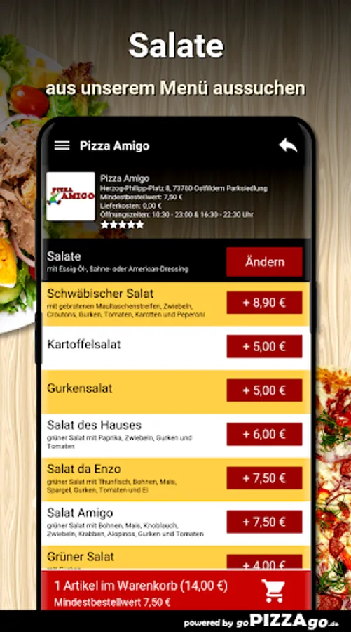 Have delicious, crunchy salads in Ostfildern Parksiedlung delivered by Pizza Service Pizza Amigo. You can choose from 21 fresh salads with Pizza Amigo: Salad Mexico is brought to your home or office for € 7.50, cucumber salad can be ordered for € 5.00 The delivery service brings you seafood salad, crispy fresh mixed salad for a price of 6.00 euros, green salad is available online for just 4.00 € for delivery. Tuna salad can be ordered for € 7.50, tomato salad with vinegar-oil, cream or American dressing and Italian salad with vinegar-oil, cream or American dressing are available from Pizza Amigo for € 7.50.