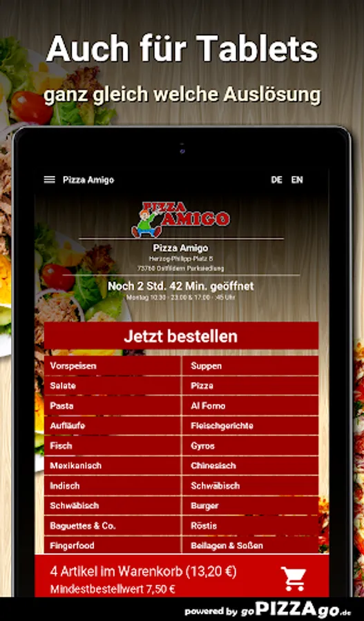You can order and pay for freshly prepared food online from our Pizza Amigo delivery service in Ostfildern Parksiedlung. We offer more than 333 delicious dishes. Do you fancy something sweet? Then order a dessert like Ben & Jerrys Half Baked, Häagen Dasz Vanilla, Ritter Sport, Ben & Jerrys Phish Food, Häagen Dasz Coconut Chocolate, Häagen Dasz Peanut Butter Crunch. Customers find the following specialties the bestWhen we bring your food