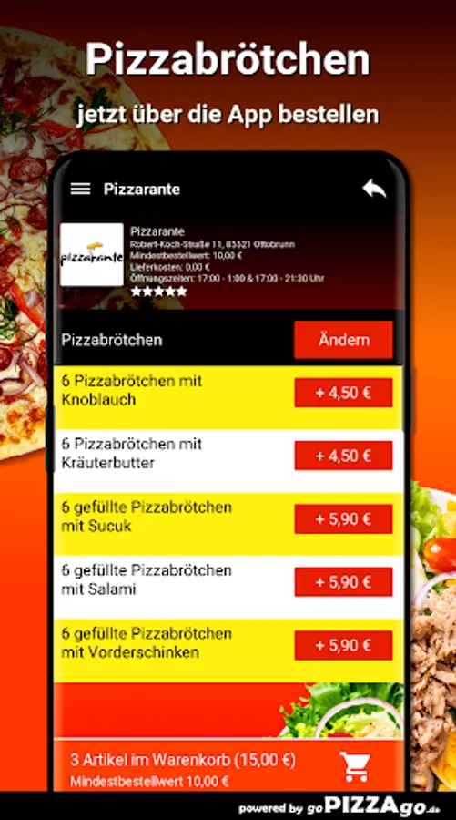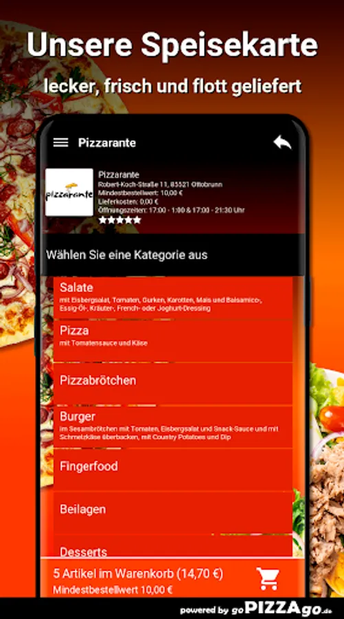 Pizza BBQ can be brought to you for € 10.30 to € 22.50, the delivery service brings you an aromatic, tasty Pizza Prociutto at a price of € 9.70- € 19.00, Quattro Formaggi pizza, Calzone pizza is brought to you for 11.30 Euros to almost every district as well as pizza mozzarella. Let Pizzarante pamper you with culinary delights!
