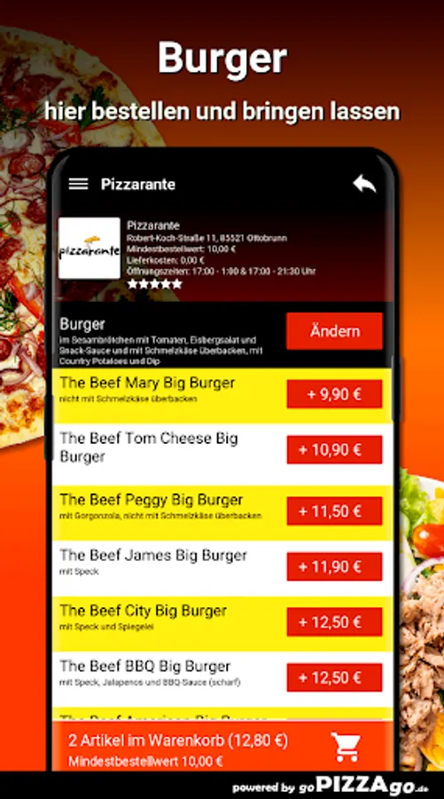 Searched and found: Delicious burgers from Pizzarante You can also order delicious burgers from us. The Beef My Dream Big Burger. The Chicken City Big Burger for a fabulous € 12.90, deliciously appetizing The Beef Smoking Bandit Big Burger with ajvar, rosemary and shepherd's cheese delivered to your place of residence for € 12.90, The Chicken Honey Mustard Sauce Big Burger (€ 11.90) . The Beef Peggy Big Burger € 11.50 and The Beef American Big Burger € 12.50.