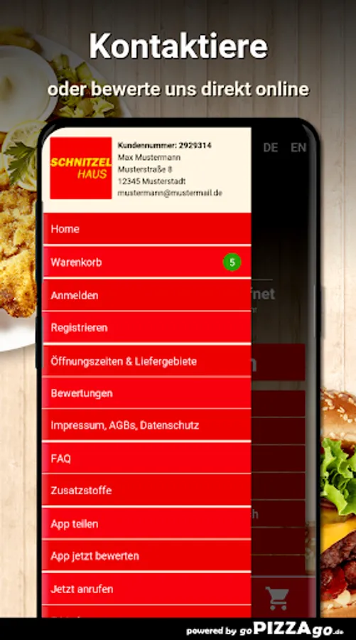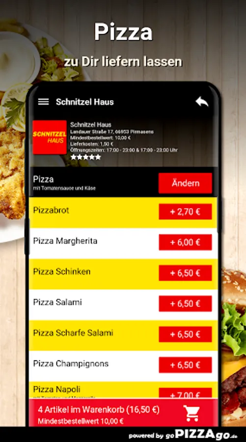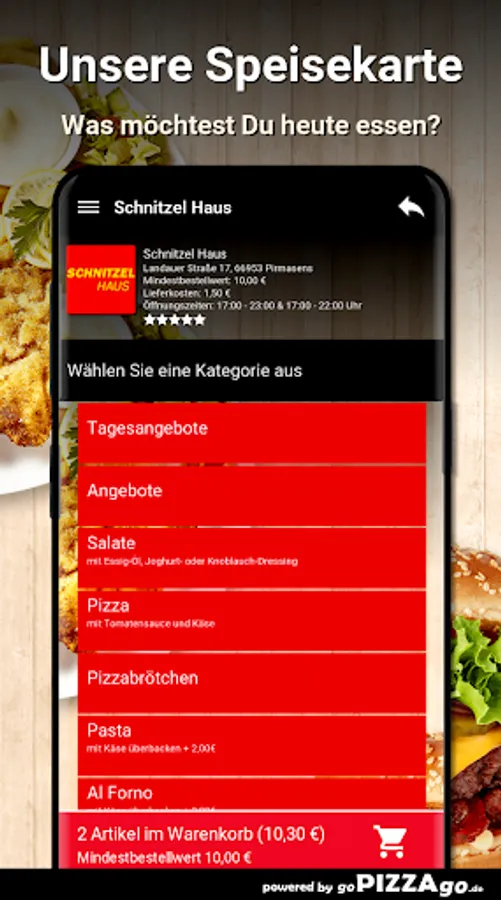 You can order an unbelievable selection of delicious dishes quickly and securely online from our home service Schnitzel Haus. You can expect an offer of over 233 dishes such as double hamburger, rigatoni carbonara, pizza vegetarian as well as pizza calzone for 9.00 €. Our top 7 items Our delivery times