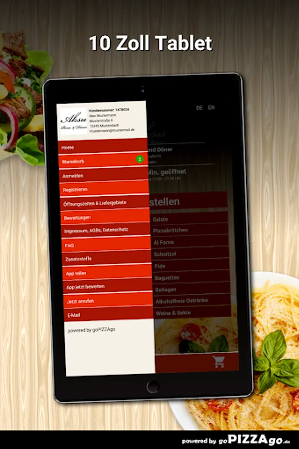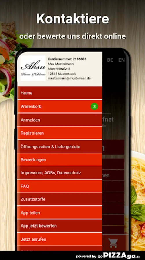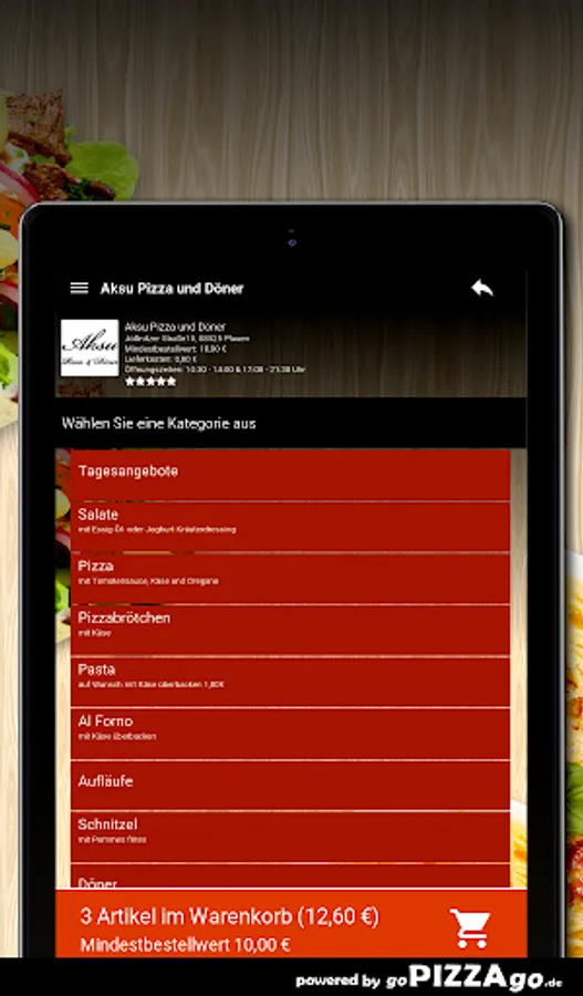 You can order and pay for meals and delicious dishes online from the delivery service Aksu Pizza and Döner (08525 Plauen). The range of our varied dishes includes 170 dishes (Macaroni Orchidea, Pizza Carfiofi, Tagliatelle Napoli, Pizza Vegetaria, Pizza Rex or Baguette Salami for EUR 3.00). Customers like to order these dishes When can I order pizza and kebab at Aksu?