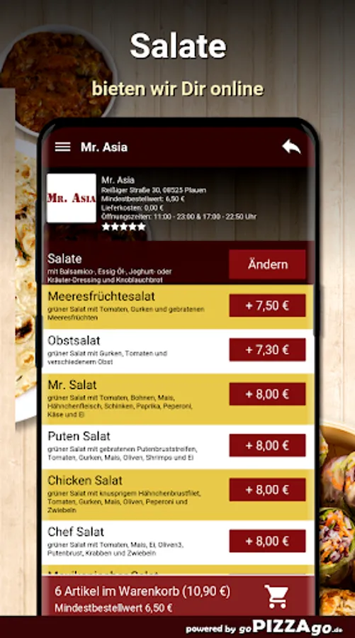 Ein relativ breites Sortiment an Salaten gibt es natürlich auch beim Lieferdienst Mr. AsiaVerlockende Salate (19) kannst Du hier ebenso bestellen & flink liefern lassen. Hirtensalat bekommst Du bei Mr. Asia für 8,00 €, frisch zubereiteten Mozzarella Salat, Obstsalat 7,30 Euro, Italienischer Salat, absolut leckeren Bauernsalat gibts für 7,00 €, Salat Hawaii bekommst Du an Deinen Wohnsitz geliefert für 7 €.