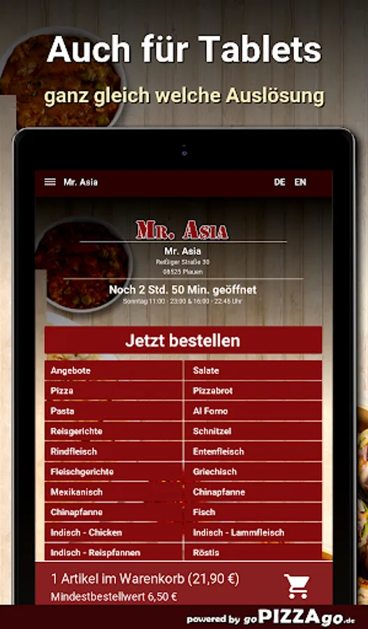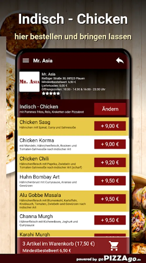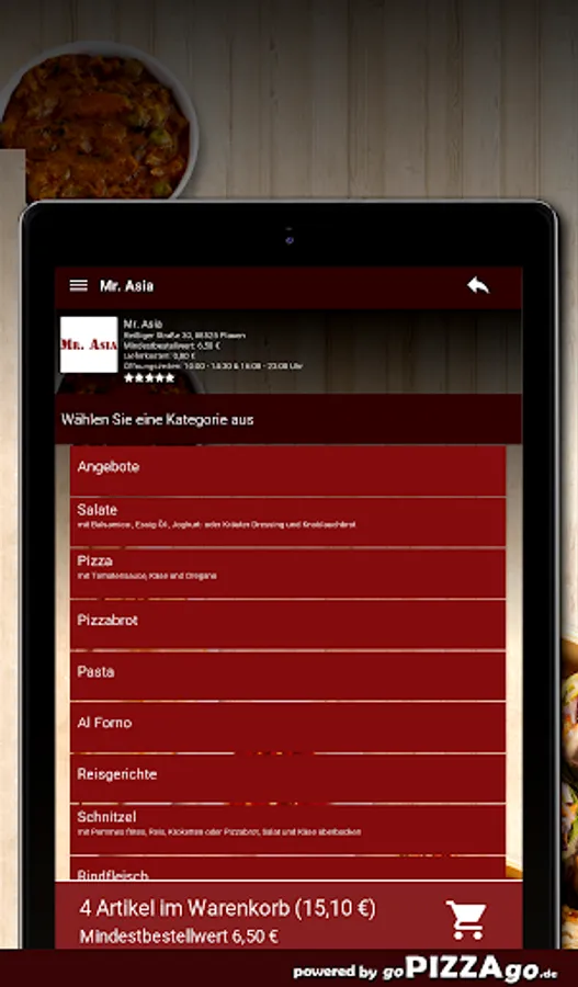 Viele Schlemmereien kannst Du bei unserem Lieferservice Mr. Asia easy online bestellen. Wählen Sie aus mehr als 296 genüssliche Gerichte wie Schnitzel Spezial, Pizza Schinken Champignons und Peperoni, Chicken Korma aus der Moghul-Küche, Pizza Valentino oder auch Ananas-Hähnchen-Auflauf für 8,50 €.Was wird sehr gerne bestellt ?
