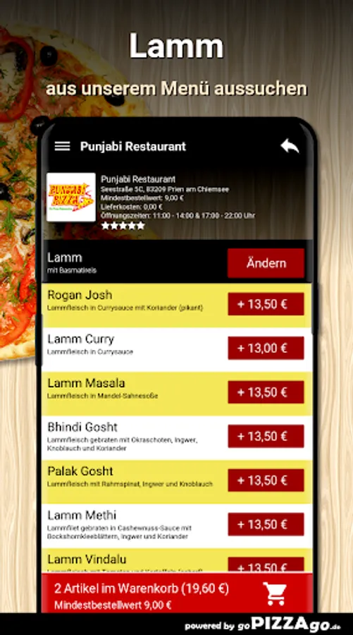 If you like Indian food in Prien am Chiemsee, you can definitely eat delicious Indian food with us. Bharta. Palak paneer with basmati rice, Malai Kofta can be ordered for € 12.50, aromatic Vegetable Pakora delivered quickly, lamb Vindalu for a fabulous € 13.50, duck Jalfrezi 14.50 euros, duck mango with basmati rice, lamb masala lamb in almond cream sauce you can order it online here for just 13.50 euros, you can order chicken tikka with basmati rice for 11.50 euros, and you can get excellent Palak Gosht for 13.50 euros. We look forward to your visit to Punjabi Restaurant!