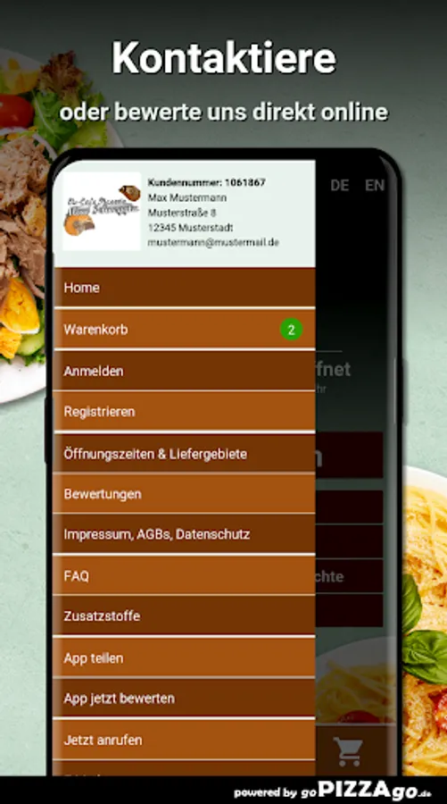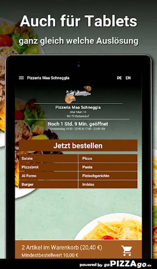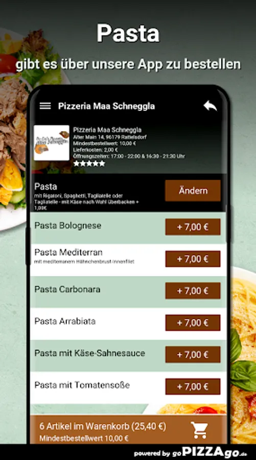 Frisch zubereitetes Essen können Sie bei uns flott wie auch richtig sicher online ordern. Wir bieten Dir mehr wie 150 Speisen & Getränke, unter anderem Pizzabrot, Pizza Teuflisch feurig, Currywust, Lasagne Kreta, Gewürzter Käserand pikant sowie Pasta Carbonara für 7,00 €.Was wird sehr gerne bestellen?Essen bestellen können Sie zu diesen Zeiten