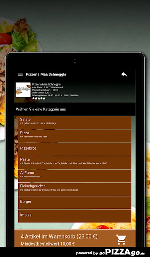 Die italienische Küche bietet natürlich viel mehr als Pizza und Pasta, teste es beim Lieferdienst Pizzeria Maa Schneggla aus101 geniale italienische Gerichte kannst Du bei Pizzeria Maa Schneggla einfach bringen lassen. Pizza Spinat bietet man hier online an für lediglich 5,20- 20,80 € zum Bringen, Pizzateig-Rohlinge klein 150g, Pasta Bolognese bekommst Du an Deinen Wohnsitz geliefert für 7 Euro, Pizza Margherita mit Tomatensauce und Käse, Pizza Chef bietet man hier online an für lediglich von 5,20-27 Euro, Pizza Maa Schneggla erhälst Du für 5,20- 27,00 €, Pasta Arrabiata gibts zum Bestellen für 7,00 €, deliziöse Pizzateig-Rohlinge mittel.