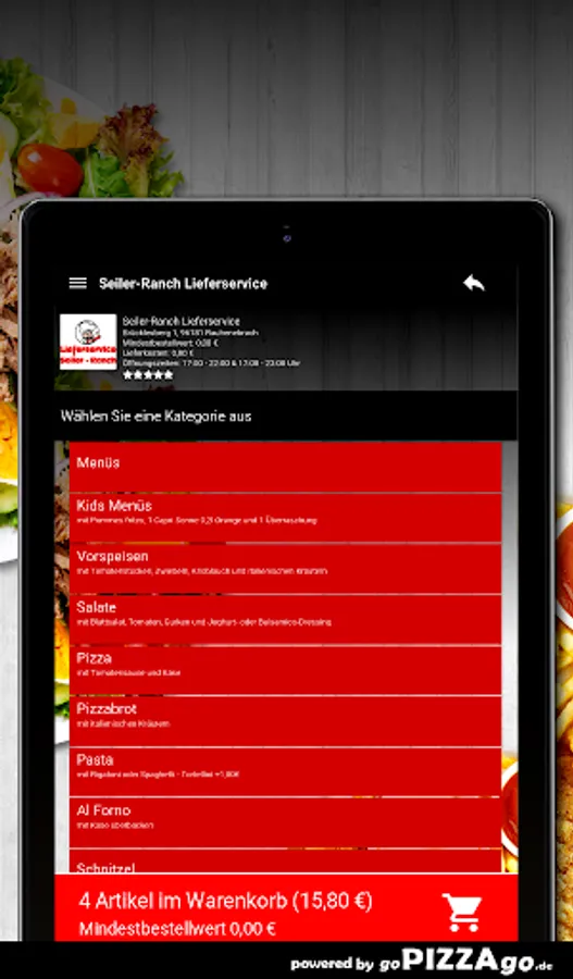 You can simply order an incredible number of freshly prepared dishes from our pizza service and have them delivered immediately. In our online menu you will of course find 49 dishes such as Pizza Hawaii, Chef Salad, Mixed Salad, Pizza Special, Lasagne, Pizza Mushrooms. The hits at Seiler-Ranch delivery serviceWhen do we deliver?