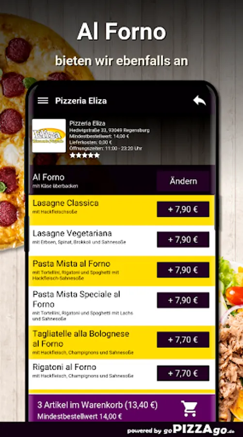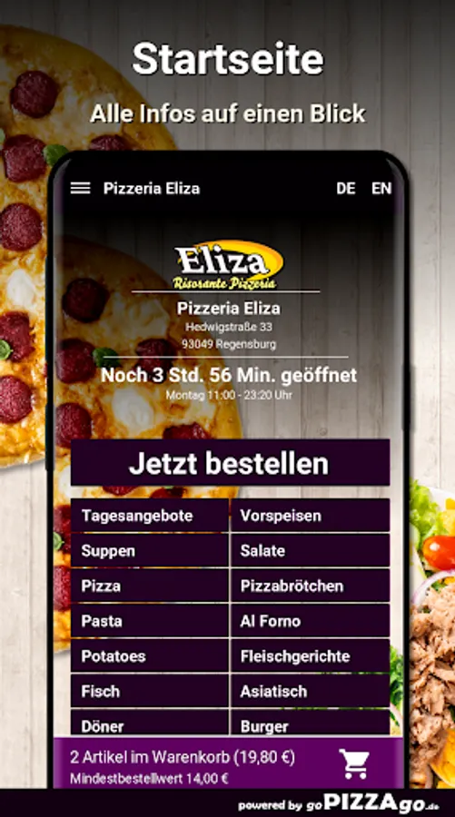 Order burgers, doner kebabs online at Pizzeria ElizaWith us you can order Al Forno, salads, fish, Asian, burgers, meat dishes, pasta online!