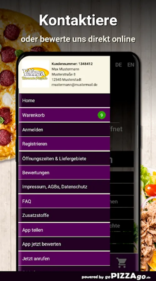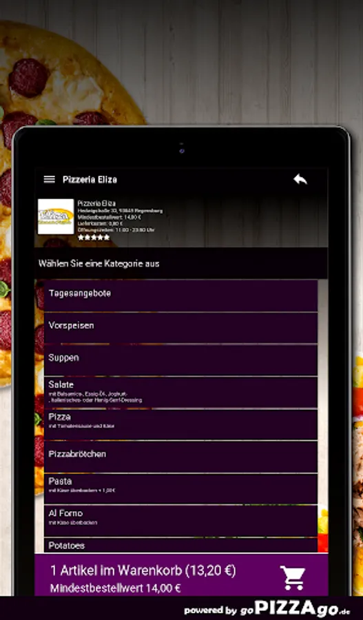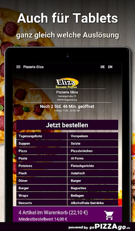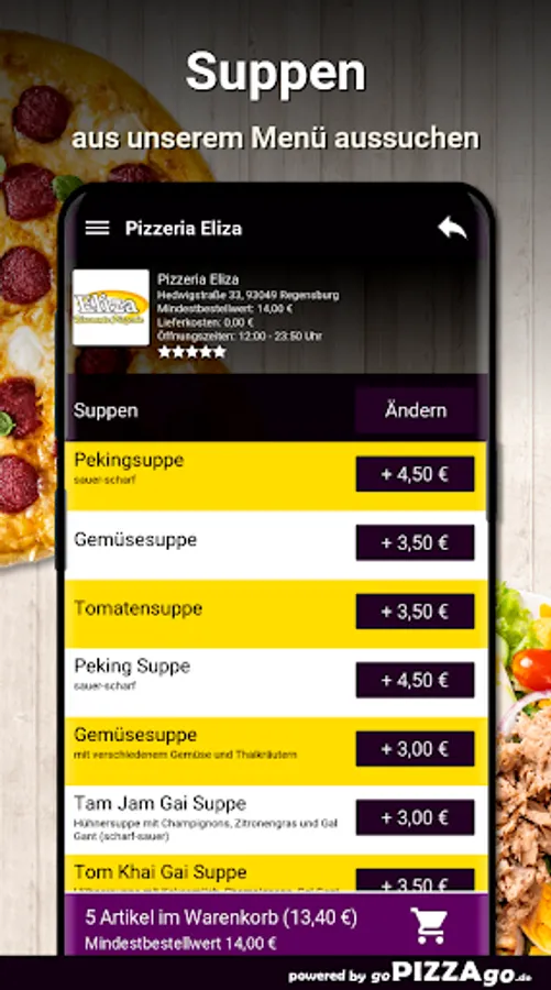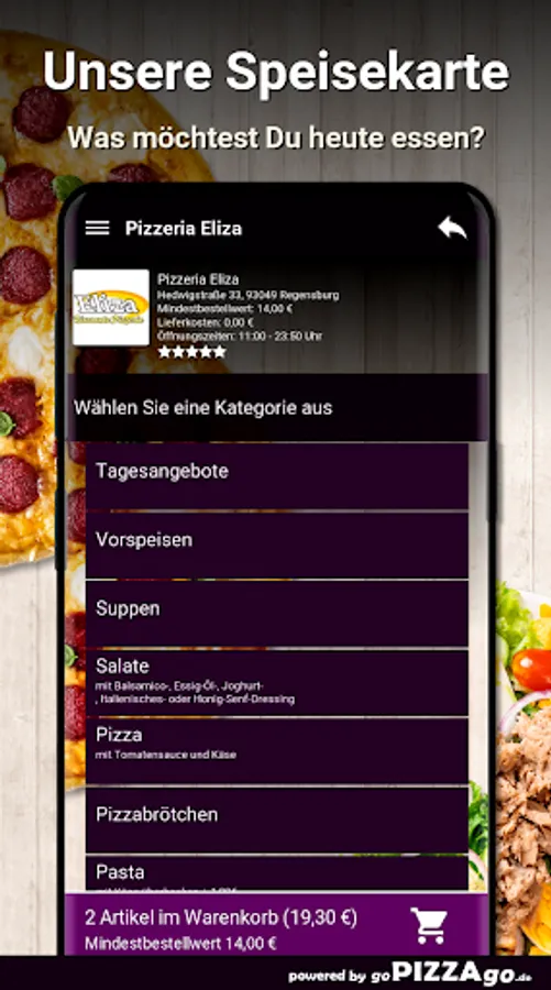 You can order dishes, deliciously prepared and delivered hot, quickly and securely online from our Pizzeria Eliza delivery service in Regensburg. In our menu you will find 311 dishes such as king prawns Gong Pad Khing, XL Italian burger menu, pizza Al Greco, pizza broccoli, kebab baguette or grill chicken wrap for € 6.90. Also order soft drinks such as mineral water, Coca-Cola, Coca-Cola light, Fanta, orange nectar. When can I order?
