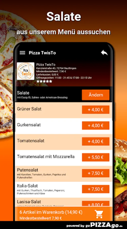 Of course, you can order a lot of goodies from the Pizza TwisTo delivery service (Kanzleistraße 40 in Reutlingen) online in our online shop. You can expect an absolutely tasty range of over 210 dishes such as Mediterranean salad, pasta verde, cauliflower casserole and Pasta TwisTo‘s 1 for € 8.90. We recommend spaghetti ice cream and tiramisu for dessert. Customers like to order these dishes Our delivery times are