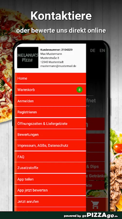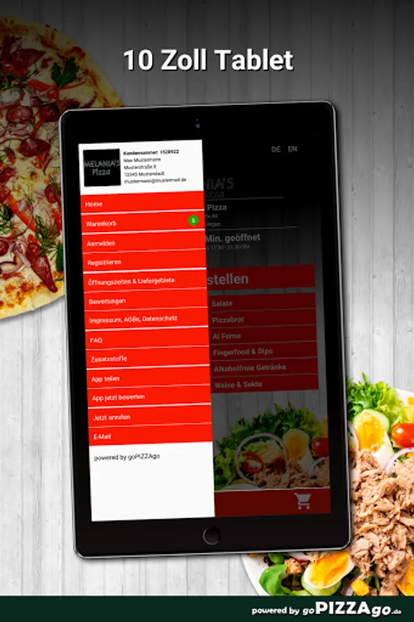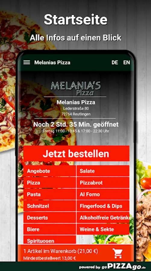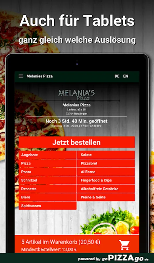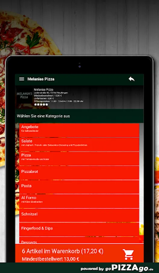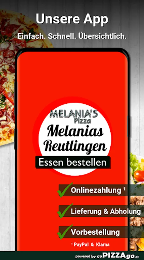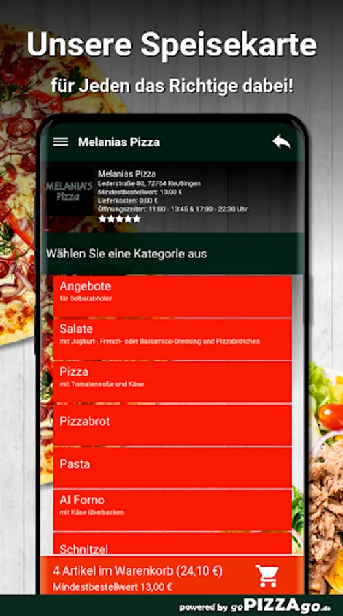 You can order and pay for tasty and fresh foods online from the Melanias Pizza delivery service (Lederstraße 80 in Reutlingen). Our offer includes more than 73 dishes and drinks (Pizza Ground Beef, Pizza Bombay, Pizza Mamma Mia, Pizza Regina, Breaded Schnitzel or Italian Salad for € 8.50). We continue to deliver soft drinks such as Spezi, Fanta, Red Bull 0.25, Sprite, Coca-Cola. Customers find the following specialties best When can I order?