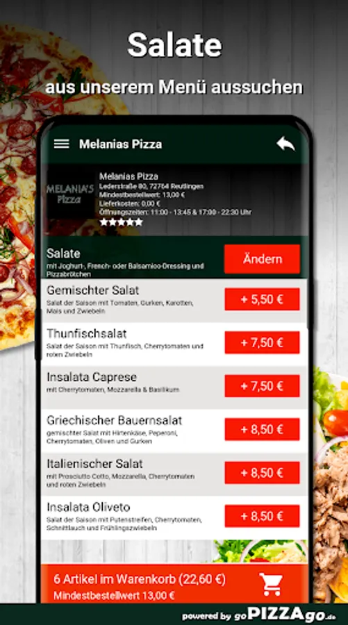 Salads in Reutlingen from Melanias Pizza: delicious mouth-watering and healthy food is also available online here A fresh range of six salads are offered to you here at Melanias Pizza. You can get freshly prepared Greek farmer's salad for € 8.50 wherever you want, you can get Italian salad at Melanias Pizza for € 8.50, absolutely delicious tuna salad, mixed salad is delivered to your home or to your home at a price of € 5.50 Office, Insalata Caprese and Insalata Oliveto are available online for just € 9.50. We look forward to your orders! Melania's pizza