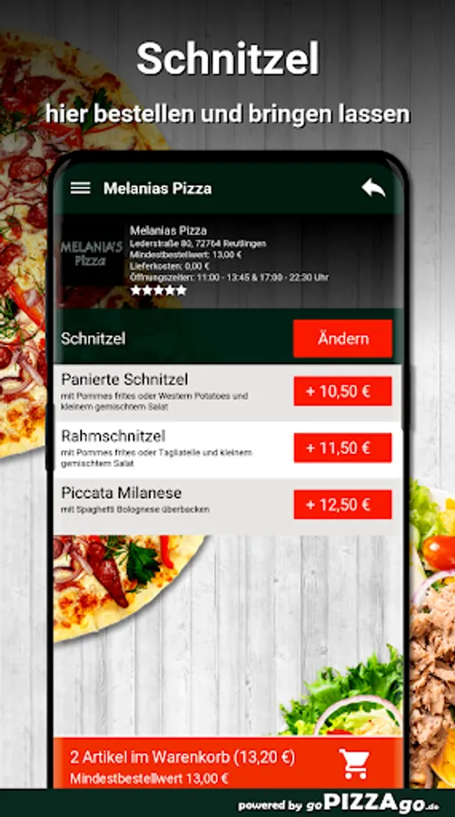 A perfect schnitzel has to be juicy and breaded crunchy - this of course also applies to the Melanias Pizza delivery service. We offer you a wonderful range of two wholesome schnitzel dishes here, Melanias Pizzas. Breaded schnitzel can be ordered for 10.50 euros and the delivery service brings you Piccata Milanese for 12.50 euros.