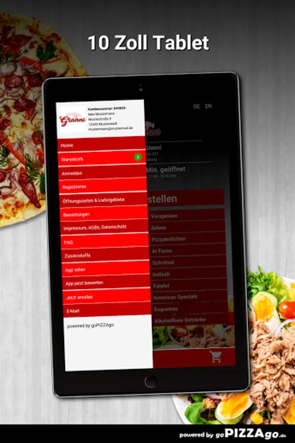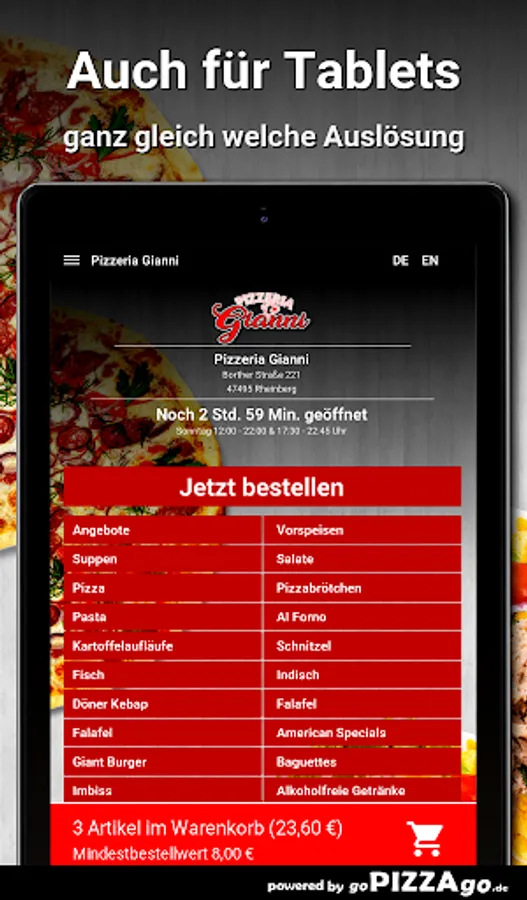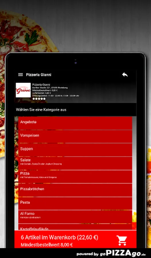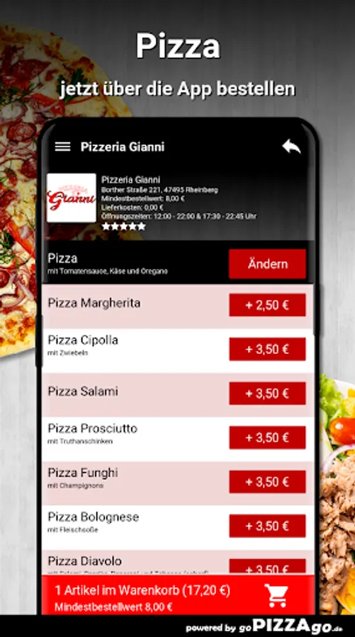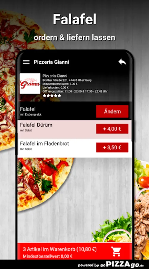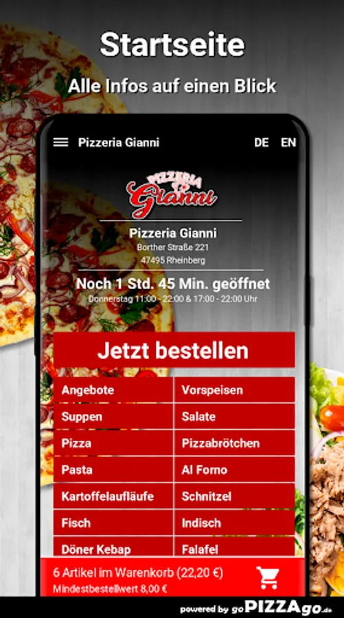 You can order delicious and fresh dishes quickly and easily on our website from the delivery service Pizzeria Gianni (47495 Rheinberg) and of course have them delivered. We have a selection of over 266 delicious dishes such as baguette with salami, pizza mafia, lamb tikka masala and baguette with ham for 4.00 euros. What do customers find most delicious? You can order food at these times