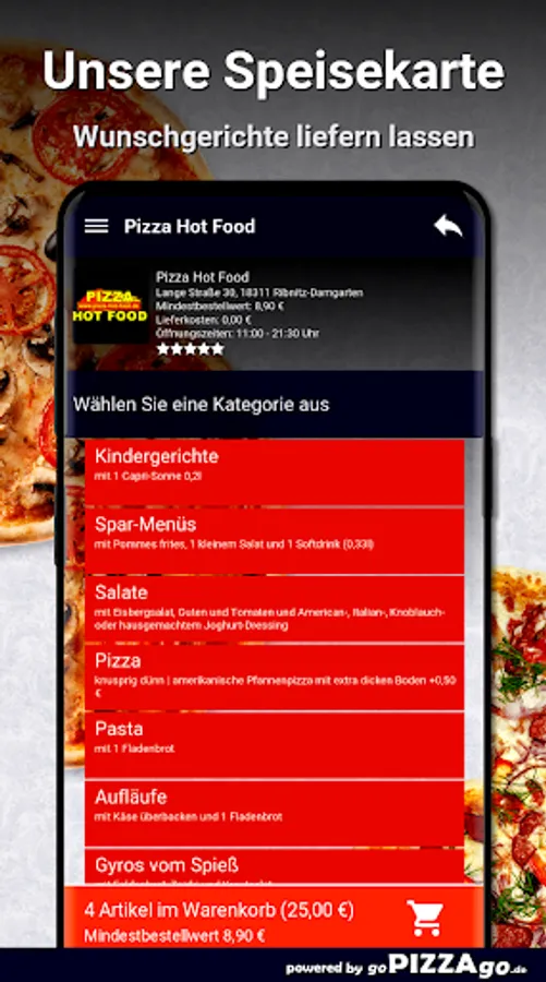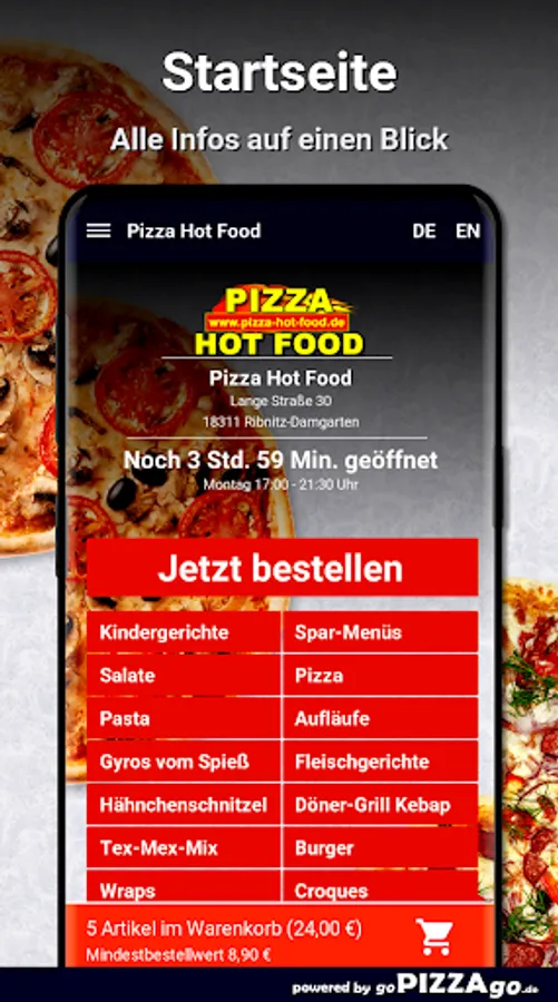 Nothing more convenient than that: Order pizzas in Pizza Hot Food Ribnitz-Damgarten .. Of course, we also have pizza in numerous flavors. Have Disneyland Pizza for delivery. Absolutely crispy X-Treme pizza. Pizza 4 seasons. Pizza Italia (€ 6.00-19.50), Pizza Gorgonzola and also Pizza Calzone Guru.