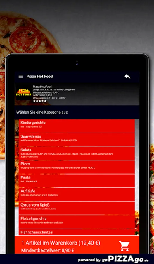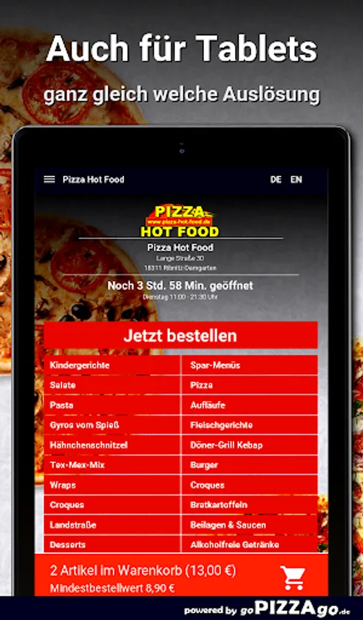 You can order quickly and safely online from a large selection of dishes in our pizza delivery service. In our menu you will find 293 meals or drinks such as Pizza Basic Pizza, Croque Hot Food, Croque Hawaii, Pizza X-treme Spezial and Croque Hawaii for EUR 3.50. Customers find the following specialties the bestWhen do we deliver?