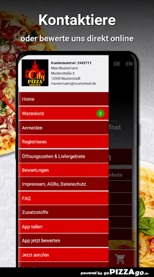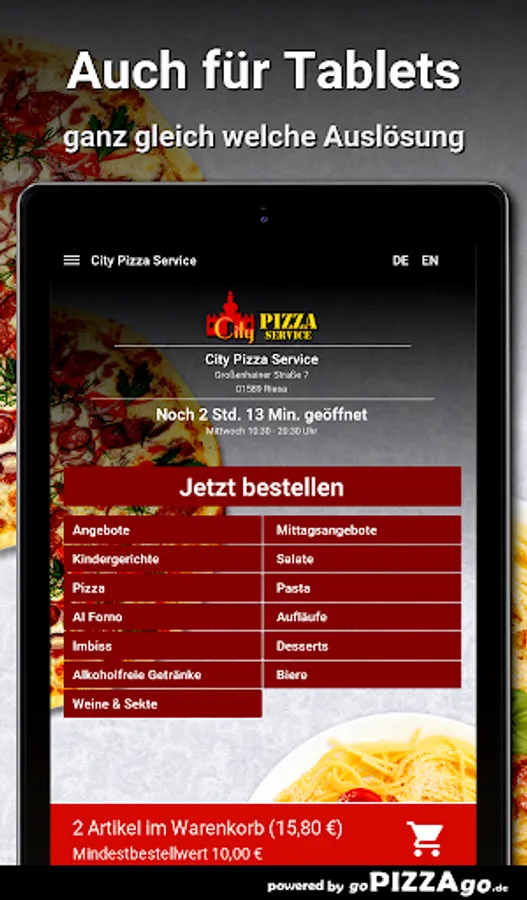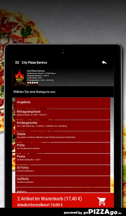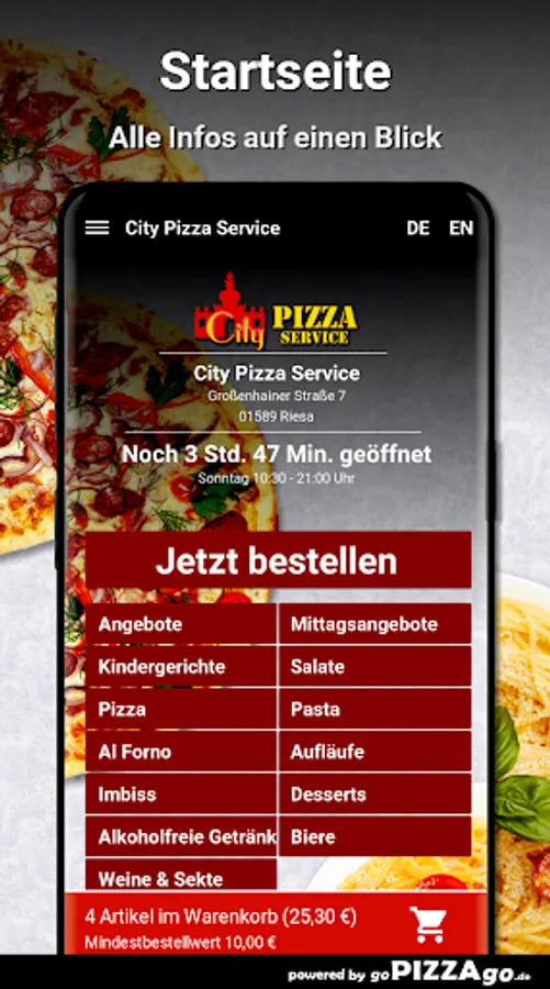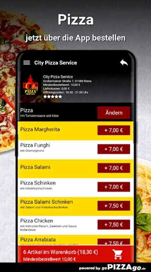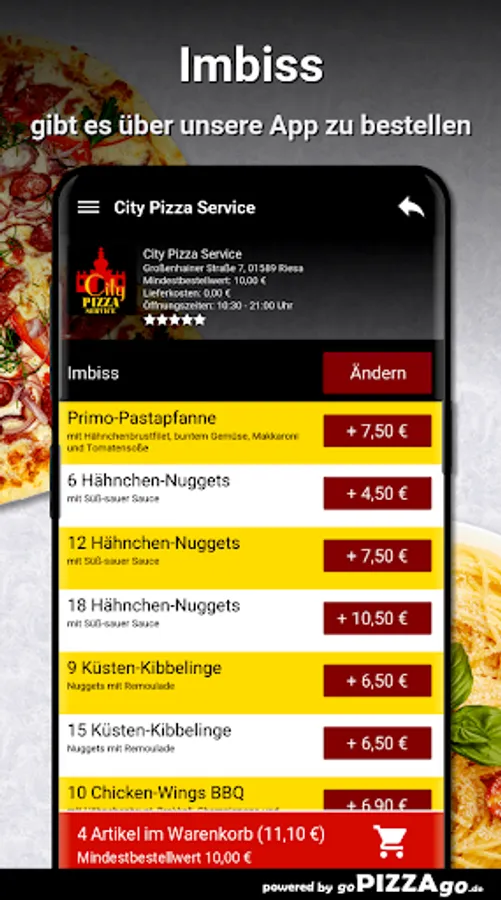 You can use this app to order delicious, tasty food quickly and securely online from our City Pizza Service delivery service in Riesa. What can we offer you? 93 delicious dishes, an extract: 12 chicken nuggets, Pizza Hanoi, Pak salad, Insalata Mista, Pizza Frattoria, Insalata Tonno, 6 chicken nuggets, Pizza France, Pizza Peking for 9.50 euros. We also have lunch like 1 pizza 24cm, 1 salad at very reasonable prices. Do you fancy something sweet? Then order a dessert like Ben & Jerrys Cookie Dough, Ben & Jerrys Caramel Chew Chew, Ben & Jerrys Caramel Sutra Core, Ben & Jerrys Chunky Monkey.City Pizza Service Top-7When does City Pizza Service deliver?