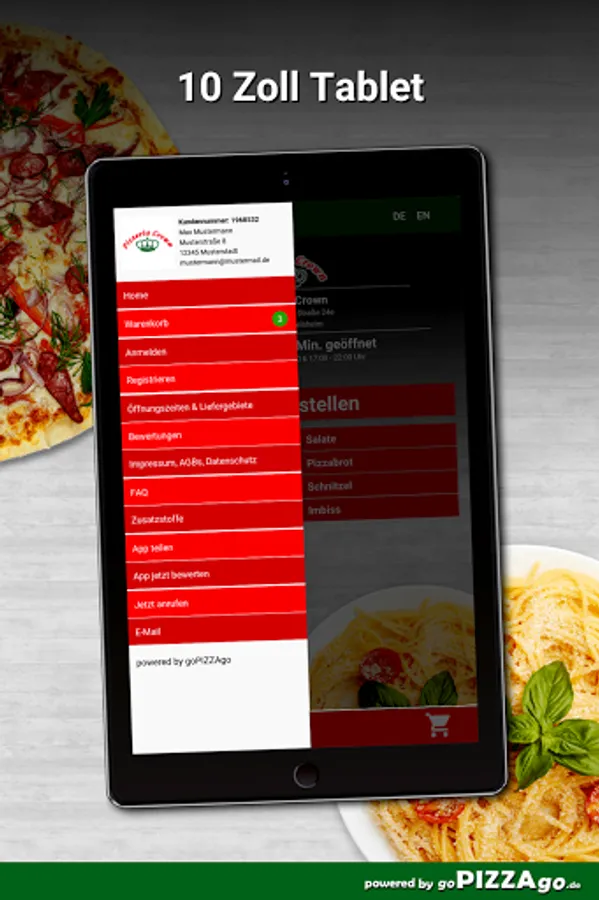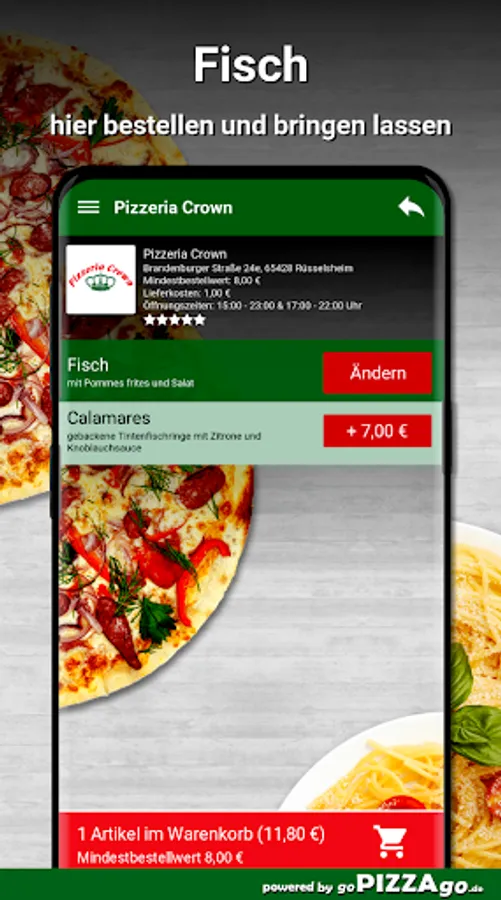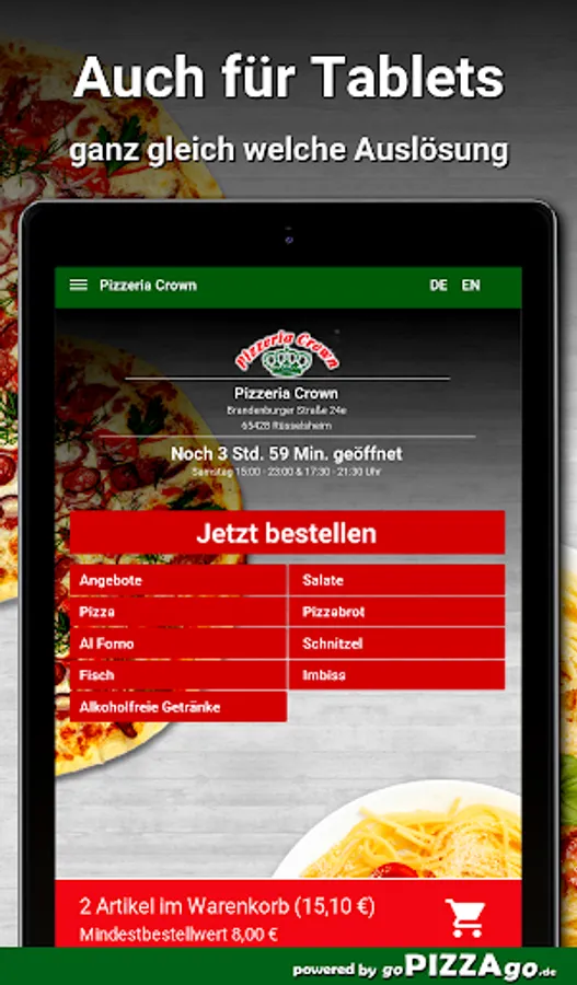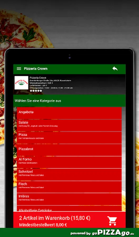 You can easily order it online from the delivery service Pizzeria Crown (65428 Rüsselsheim) from a delicious, fresh selection of dishes. You will find 67 delicious dishes online in our menu, such as head salad, gypsy schnitzel, tuna salad, pizza special or chicken schnitzel for 7.00 euros. The absolute bestsellers at Pizzeria CrownWhen can I order?