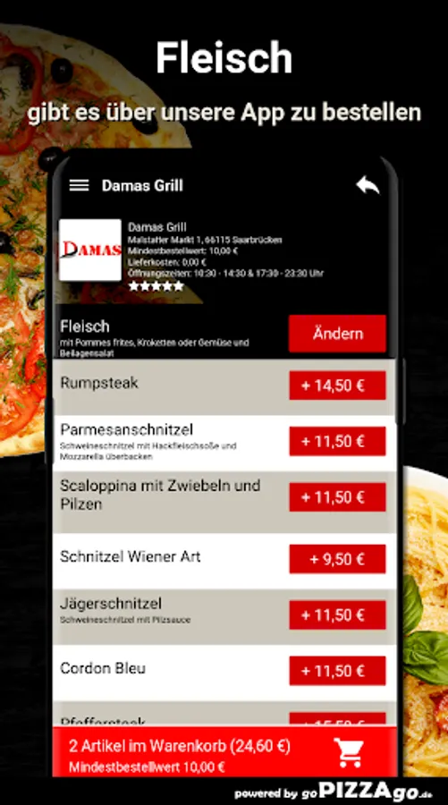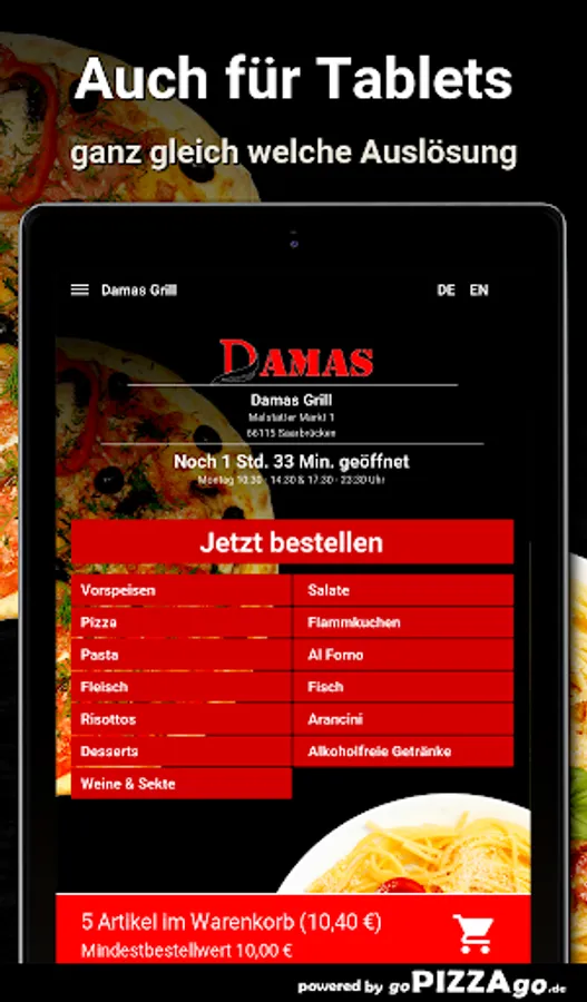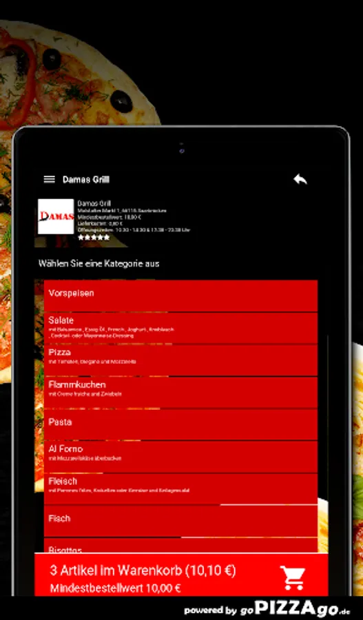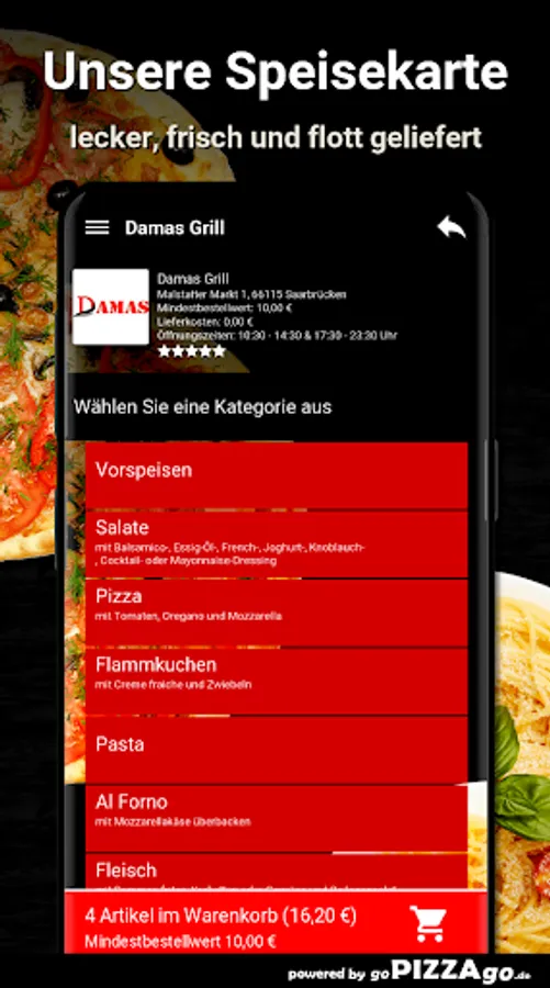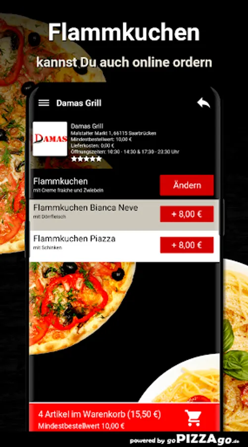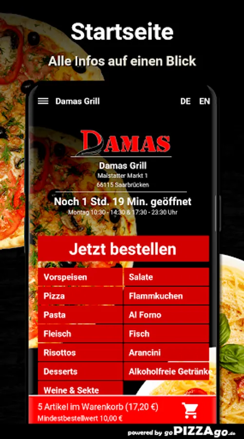 Welcome to Damas Grill in SaarbrückenWith us you can order starters, risottos, pasta, arancini, al forno, tarte flambée, salads, pizza without any problems and have them delivered!