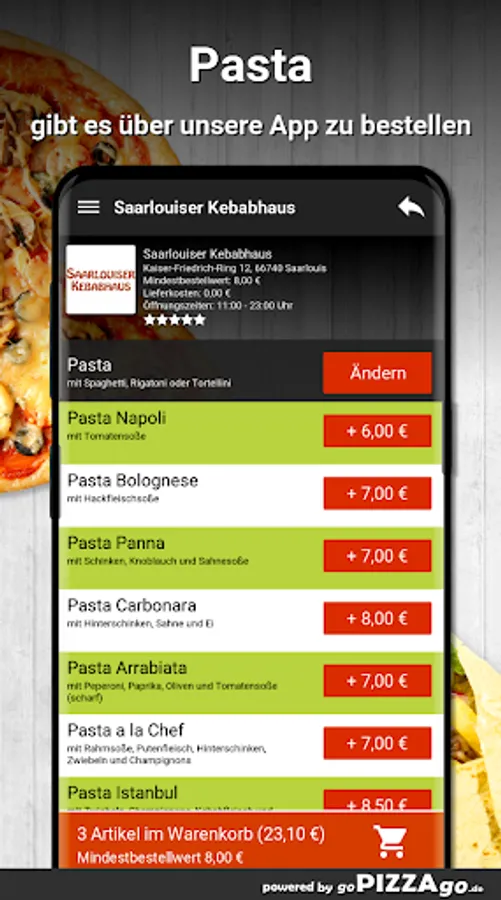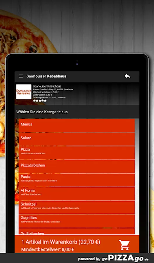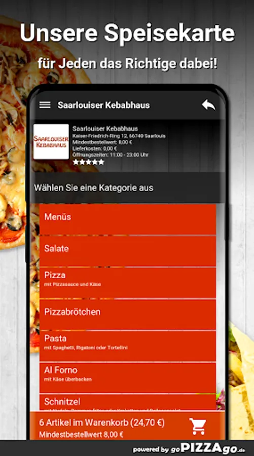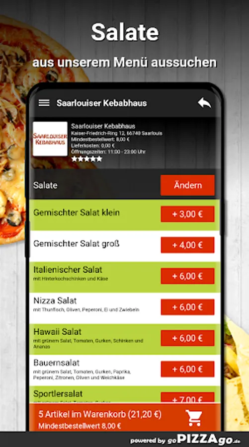 You can order and pay for it online from a delicious fresh selection of delicious dishes from our pizza service. Our offer online has 115 delicacies, including Hawaii salad, small kebab, pasta pescatore, parmesan schnitzel, burger chili and burger Hawaii for 4.00 euros. The hits at Saarlouiser KebabhausWhen we deliver your meals