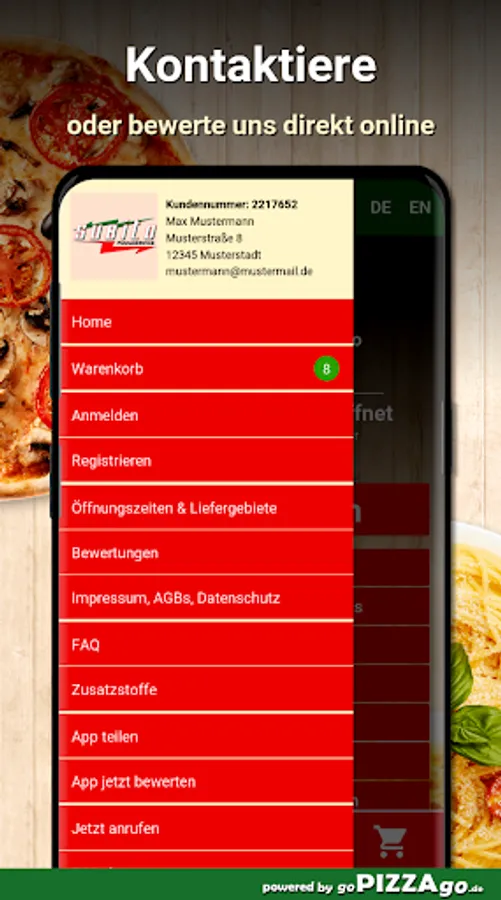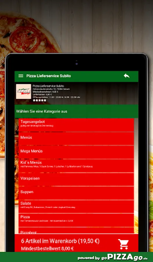 You can order from a large selection of dishes in our pizza service easy online. In menu 357 you will find delicious dishes such as Insalata di Mare, Calzone Veggie, Baguette Tomato-Mozzarella, 10 Chicken Nuggets, Bartha and Insalata Meli for 6.50 euros