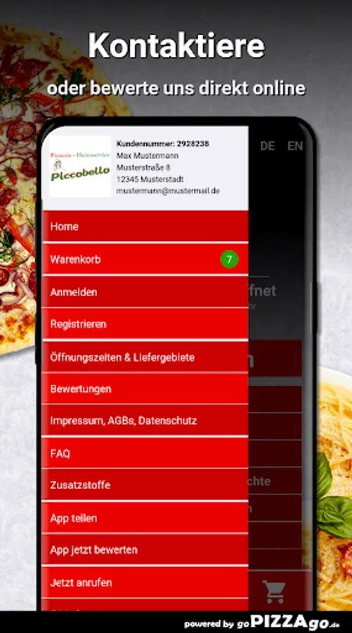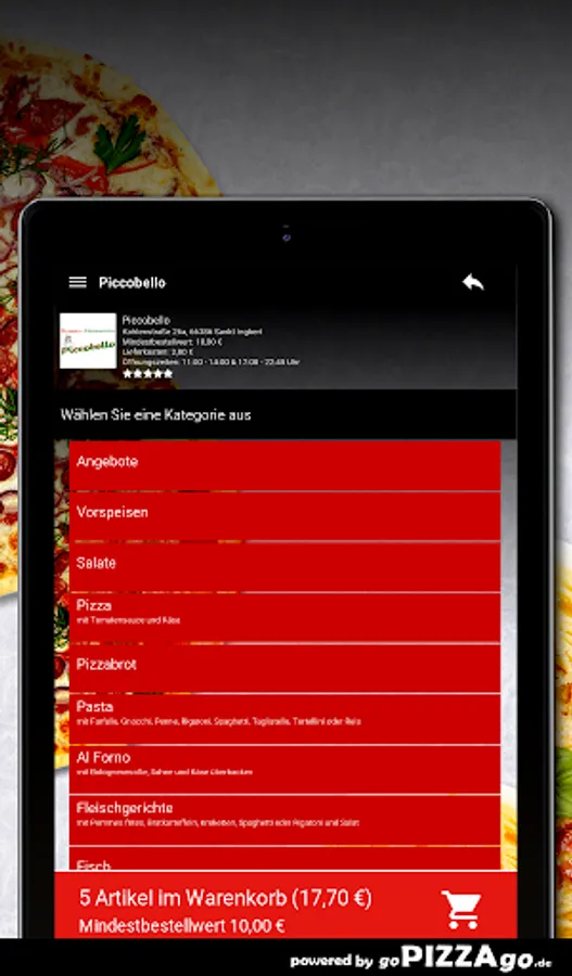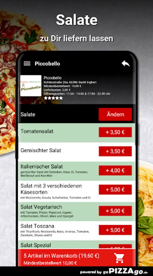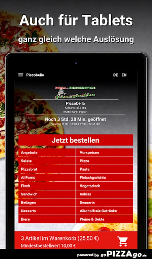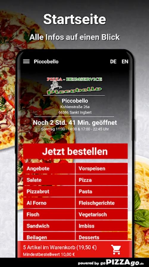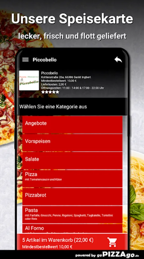 You can order freshly prepared food quickly and conveniently online in our pizza delivery service. You will find 195 meals in our menu online (ravioli spinach, 14 chicken wings, pasta Vongole or Pizza Spezial 3 for 6.50 euros). What do you like to order? We deliver at the following times