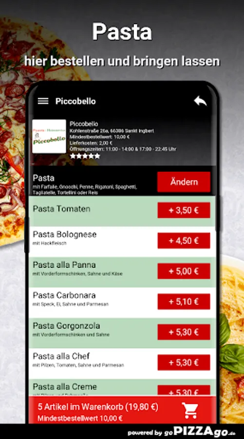 Enjoy the mouth-watering pasta dishes from Piccobello Sankt Ingbert with friends. The pasta dishes from Piccobello are a culinary adventure for the palate. With seventeen pasta dishes, we offer a delicate selection. Pasta Bolognese can be ordered for € 4.50-5.50, pasta tomatoes, pasta Alaska are available online for only 6.50-7.50 euros, pasta Gorgonzola with ham and cream is delivered to you for 5, € 30-6.70. Pasta Aglio Olio spicy with farfalle, gnocchi, penne, rigatoni, spaghetti, tagliatelle, tortellini or rice, Pasta Russi is available for € 6.10- € 7.70.