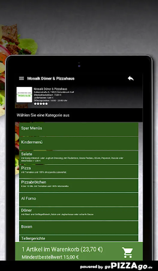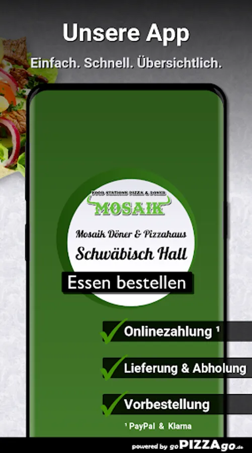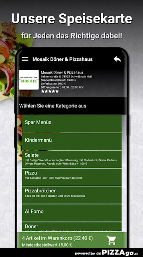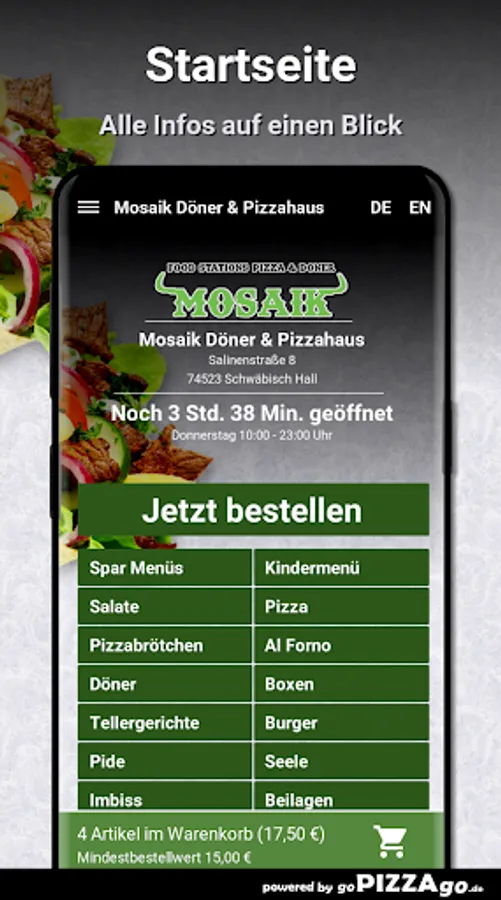 Welcome to Mosaik Döner & Pizzahaus in Schwäbisch Hall! We have, of course, Al Forno, soul, pizza rolls, pizza, pide, plates, and salads to order online.