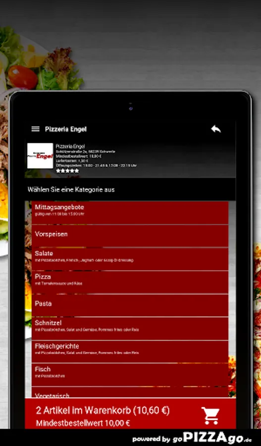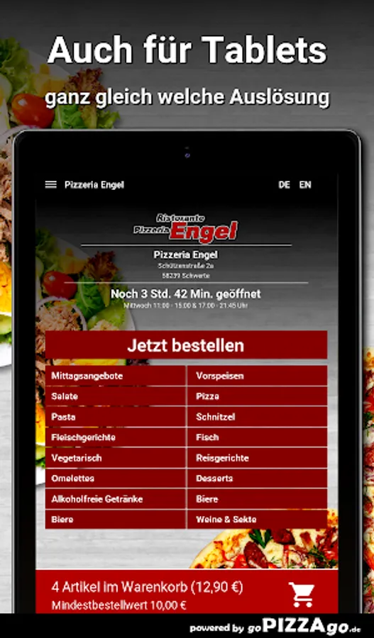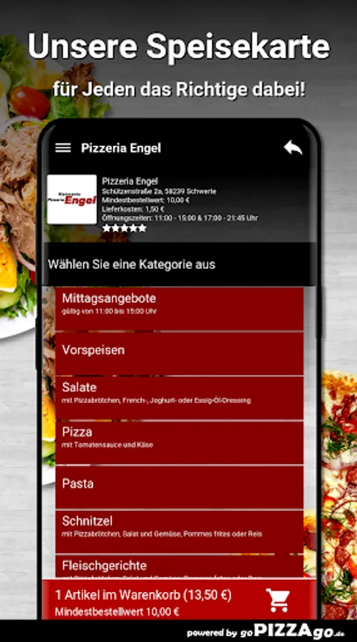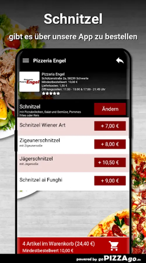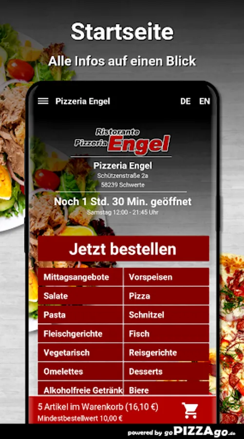 Welcome to Pizzeria Engel in Schwerte! In Schwerte, you can order meat dishes, starters, omelettes, salads, pasta and rice dishes at Pizzeria Engel and have them delivered.