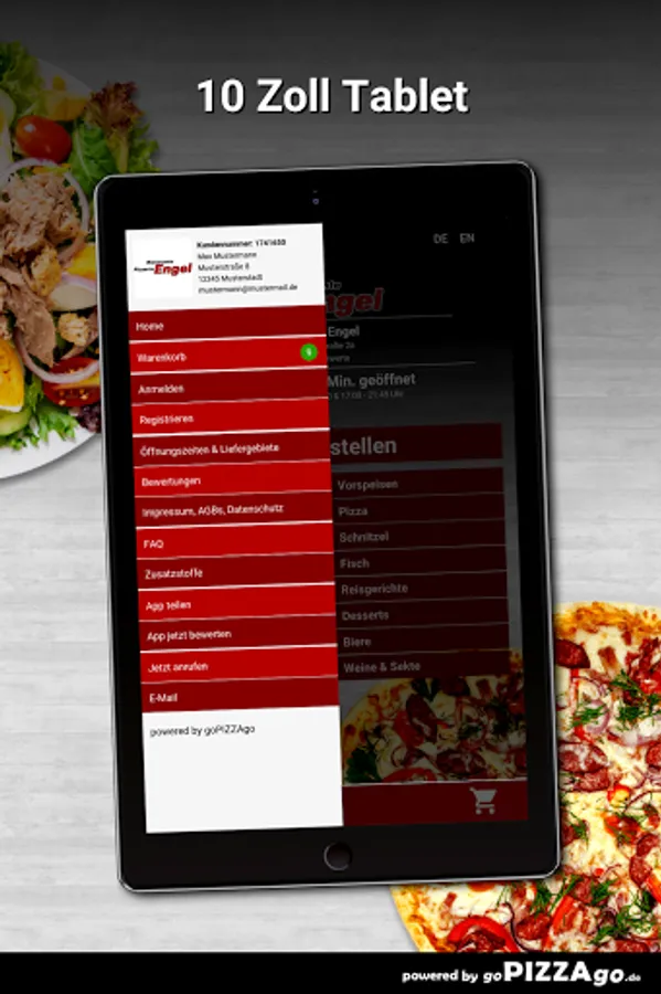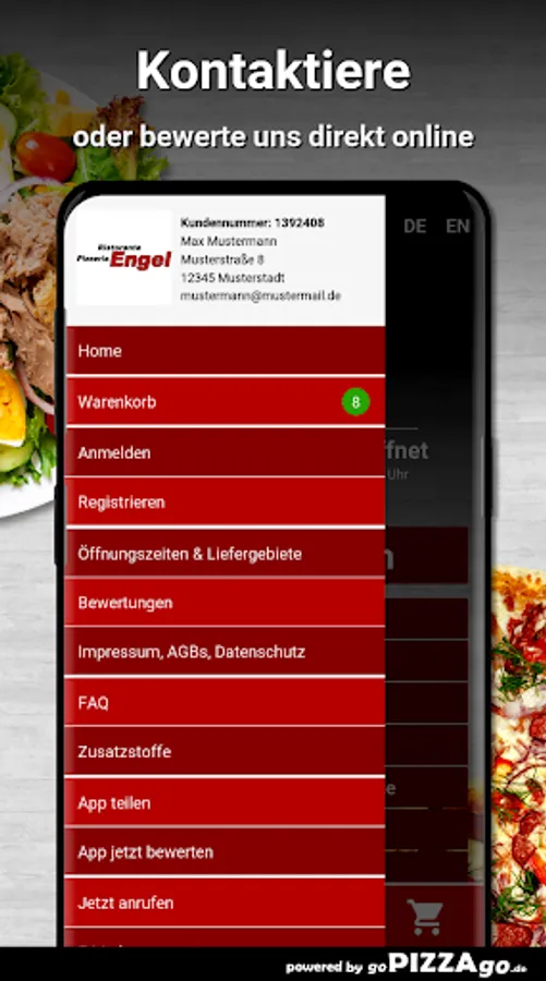 Pizza Venera with tomato sauce and cheese for an amazing € 5.00-8.00. Pizza Contadina. Pizza Poseidon can be ordered for € 5.00-9.50, delicious topped pizza spaghetti Bolognese with spaghetti and Bolognese sauce is available at Pizzeria Engel for 5.00-8.50 €, delicious topped pizza rustica 5.50-8.50 €, Pizza Calzone I, Pizza Mista are available for € 5.00-8.50 to pick up or have it delivered quickly & Pizza Mozzarella can be ordered for € 5.00-8.50.
