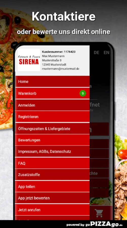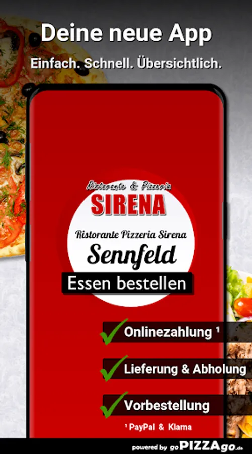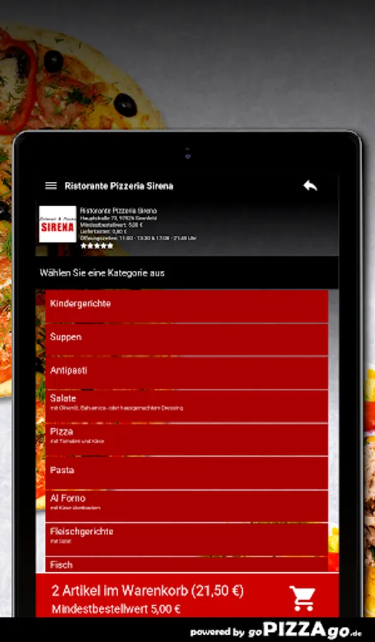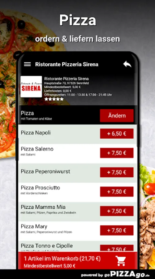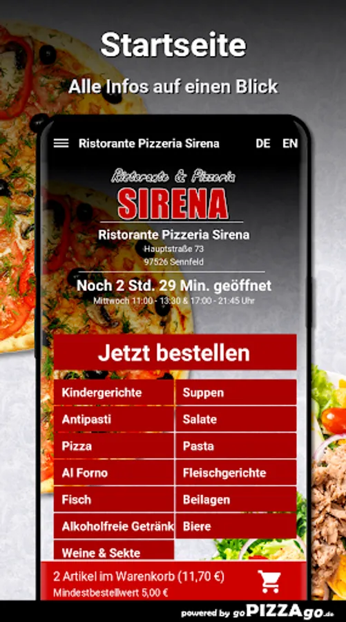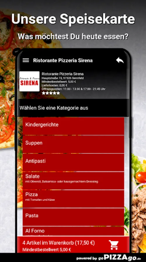 You can easily order from a large selection of meals from our Ristorante Pizzeria Sirena delivery service in Sennfeld. Our menu has more than 119 delicious dishes, a selection: cheese sticks, Pizza Italia, Pizza O Sole Mio, Pizza Romana, Gnocchi al Gorgonzola, Insalata Casa, Pizza Napoli for €6.50.The most popular delicaciesOur delivery times