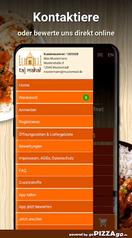 You can order delicious and fresh dishes on our website in our pizza delivery service easy online. The menu has a choice of 122 delicious dishes such as Pasta Spinaci al Forno for EUR 8.40 or Fish Karahi for € 14.90. Dessert? Our offer includes delicious half orange with ice cream, Kheer Mix, Mango Dream, half coconut with ice cream.What are our top sellersYou can order from us at these times