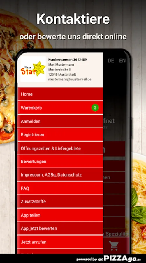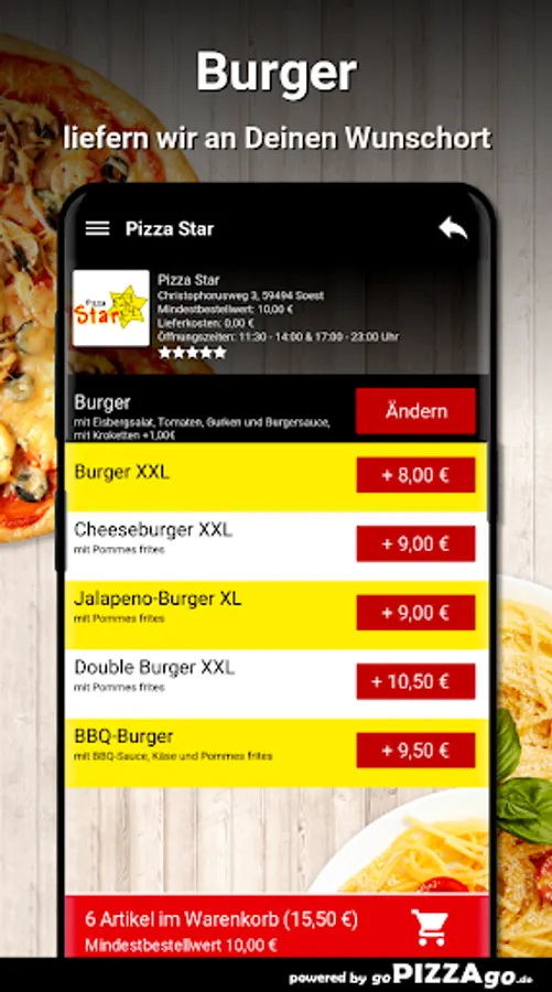 With the Pizza Star delivery service, you can discover delicious, typically Italian dishes such as pasta, pizza & lasagna. 61 typically Italian dishes can be ordered here at Pizza Star. Pasta Frutti di Mare is delivered to almost every district at a price of € 7.50, Pizza Atlanta for an amazing € 5.00-24, Pizza Star. Pizza Bavetta Bolognese with Bavetta and Bolognese sauce is delivered to your front door for € 5.00-24.00, delicious anchovy pizza is available for € 5.00-23.50, calzone pizza, seafood pizza from € 5.50- € 24.00, Pizza Calzone Sucuk with sucuk, onions and jalapenos is available for € 9.00, Pizza Kentucky to almost every district or Pizza Denver is available for € 5.00 - € 24.00.