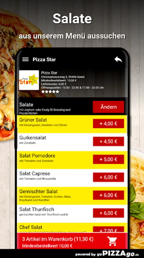 You can order fresh and delicious dishes online from our easy pizza service. We offer you more than 233 dishes (Spicy Pizza, Anchovy Pizza, 10 Salami Pizza Buns, Star Pizza, 10 Gyros Pizza Buns). The hits at Pizza Star You can also order from us at these times