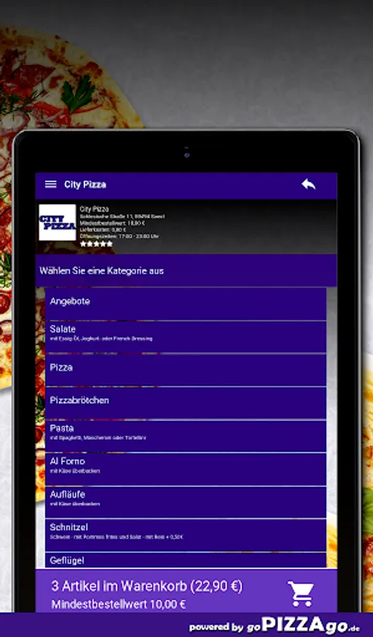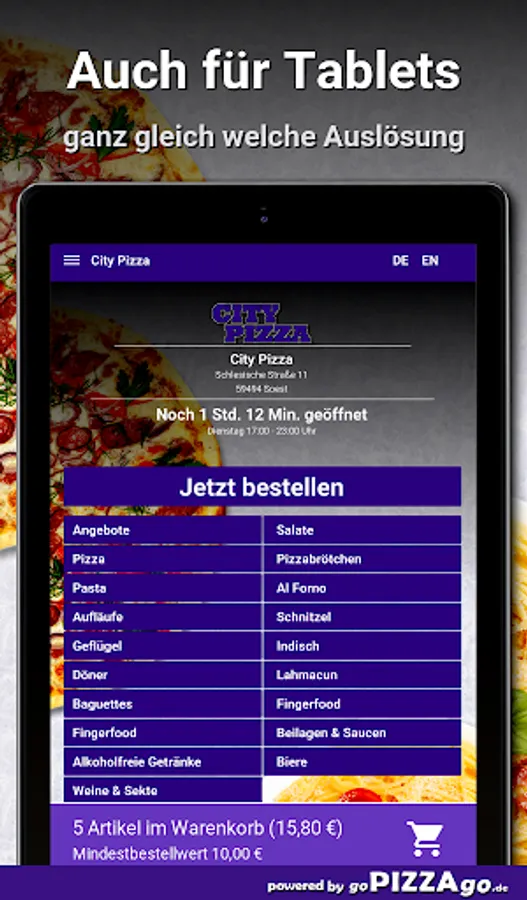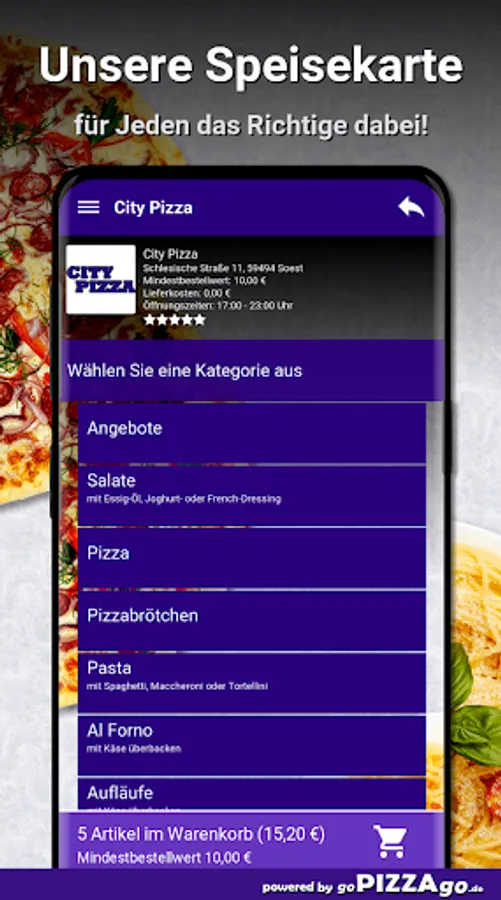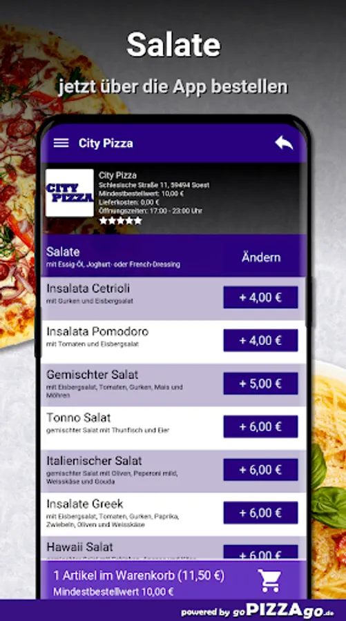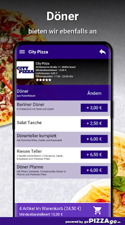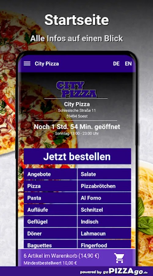 Welcome to City Pizza in Soest. At City Pizza you can order baguettes, poultry, salads, schnitzel, doner kebab, pasta, finger food, casseroles and have them delivered to your home.