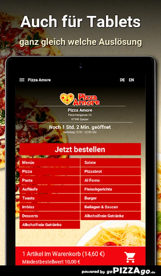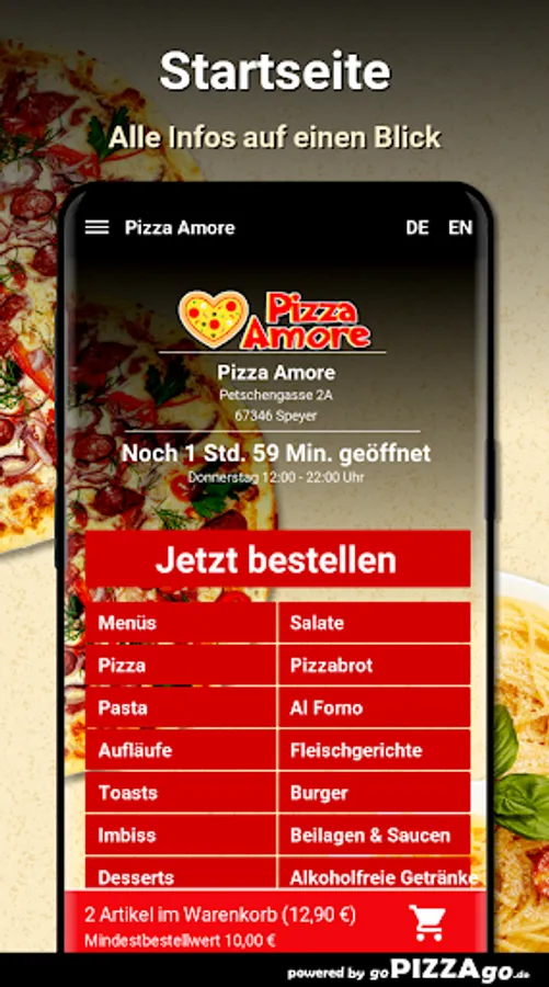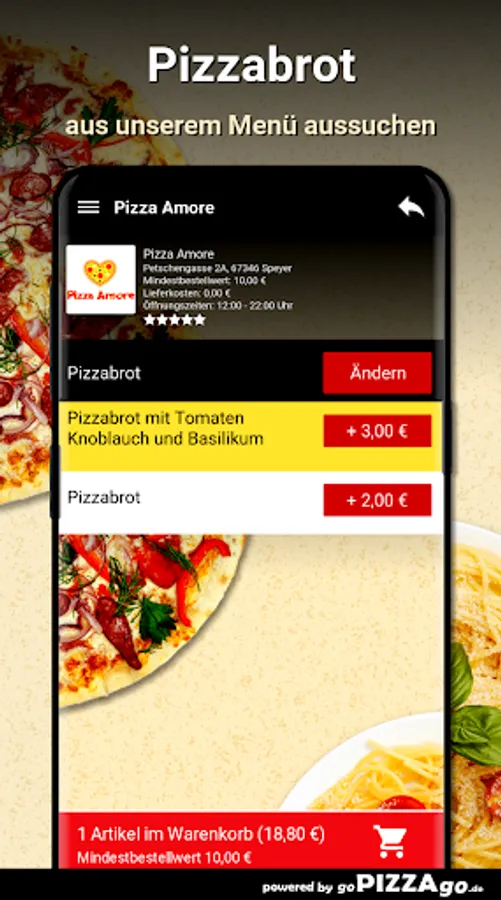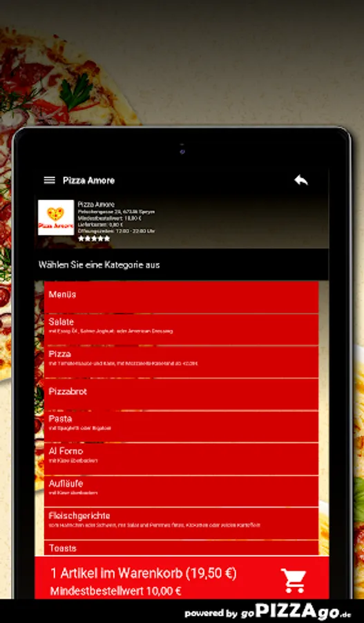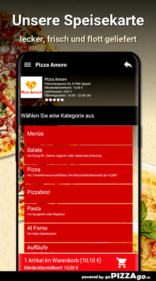 You can safely order delicacies and freshly prepared dishes from the Pizza Amore delivery service (Petschengasse 2A in Speyer) and have them quickly brought to your own four walls. We have 169 freshly prepared dishes, including Pizza Special, Pizza Pineapple, Pizza Kentucky, Schnitzel Wiener Art, Pizza Mozzarella, Green Salad, Pizza Half-Half, Hawaii Schnitzel and Chicken Casserole for € 8.50. Dessert? Our offer includes delicious spaghetti ice cream, tiramisu. We continue to deliver soft drinks such as orange juice, apple juice, Mezzo Mix, Sprite, Fanta.What are our big sellers? You can order delicious dishes from us at these times