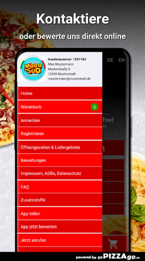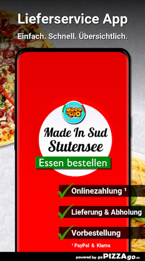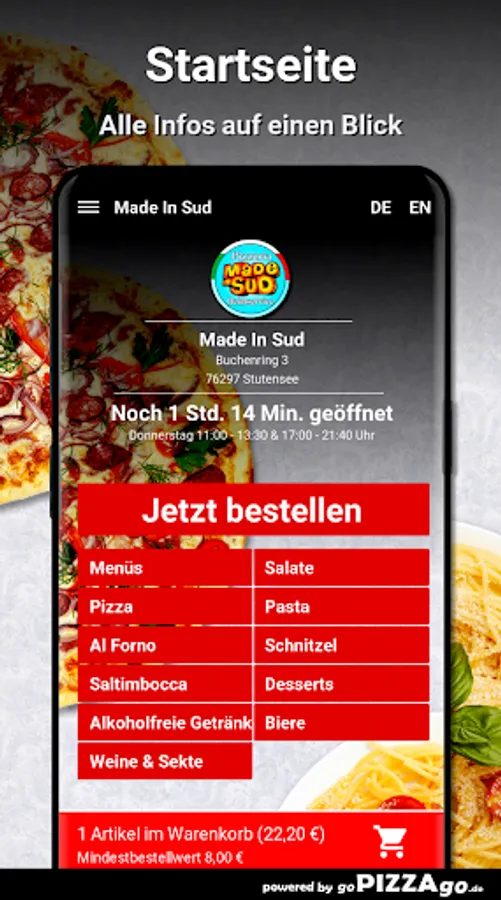 Pizza in Stutensee? Made In Sud has the ingenious offers for you! The crispyest pizzas are available here at Made In Sud to be delivered and enjoyed. Pizza Susenzo, crispy Pizza Bomba with mushrooms, bacon and eggs 7.70 to 16 €, Pizza 4 Stagioni can be ordered and delivered for 8.00-16.10 euros, absolutely crunchy pizza Bolognese (8.00-17, € 10) & Pizza 4 Formaggi can be ordered for € 8.00-16.10.