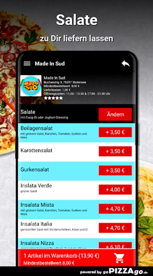 In Stutensee you can also order delicious salads from Made In Sud.The salad dishes at Made In Sud are a vital experience. We offer you eleven salads. Healthy Insalata Nice. You can get Inslata Verde, Engel Salat delivered to your place of residence for 8.40 €, carrot salad is delivered at a price of 3.50 €, as well as fitness salad the delivery service brings you at a price of 8.00 €.