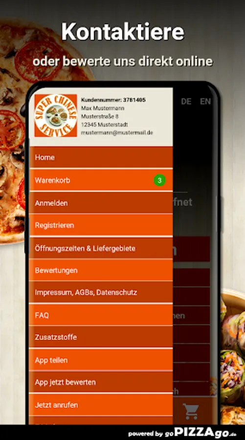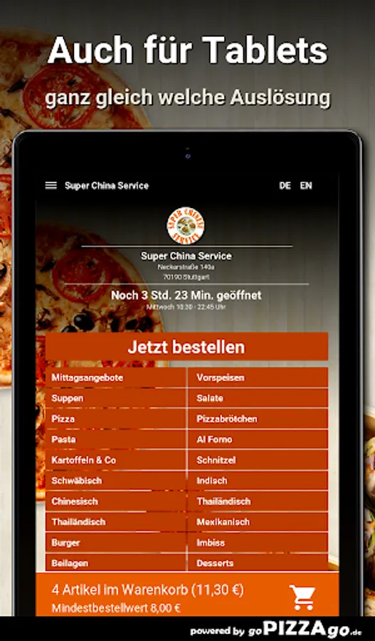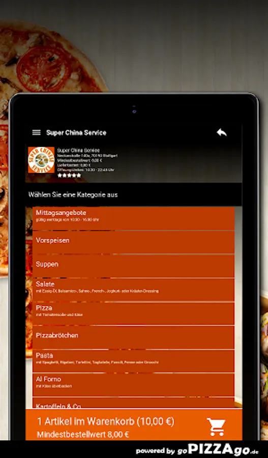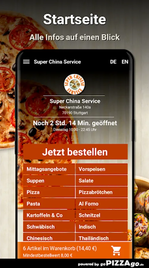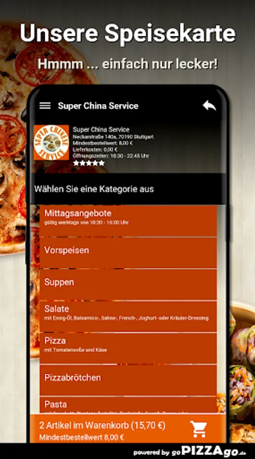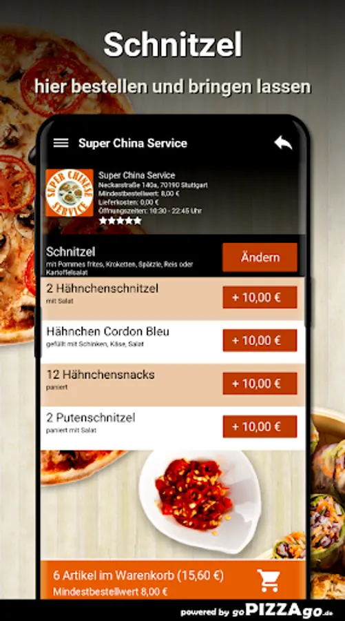 Frisch zubereitetes Essen können Sie bei unserem Pizza-Lieferservice flink bestellen und vielleicht in das Büro oder nach Hause bringen lassen. Mehr als 481 Speisen und Getränke wie Pizza Americano für € 10,00 oder Mexiko-Topf-Auflauf für € 10,00. Wir liefern weiterhin Durstlöscher wie Fanta, Coca-Cola Zero, Coca-Cola, Sprite, Mango Juice. Keine Lust heute Mittag zu kochen? Dann bestelle doch einfach Mittagsangebote wie Huhn gebraten mit Zwiebeln, Pasta, Panäng Gai, Rind Nasi Goreng, gebratenes Rotbarschfilet. Unsere beliebten Artikel sindWann wird bei Super China Service geliefert?