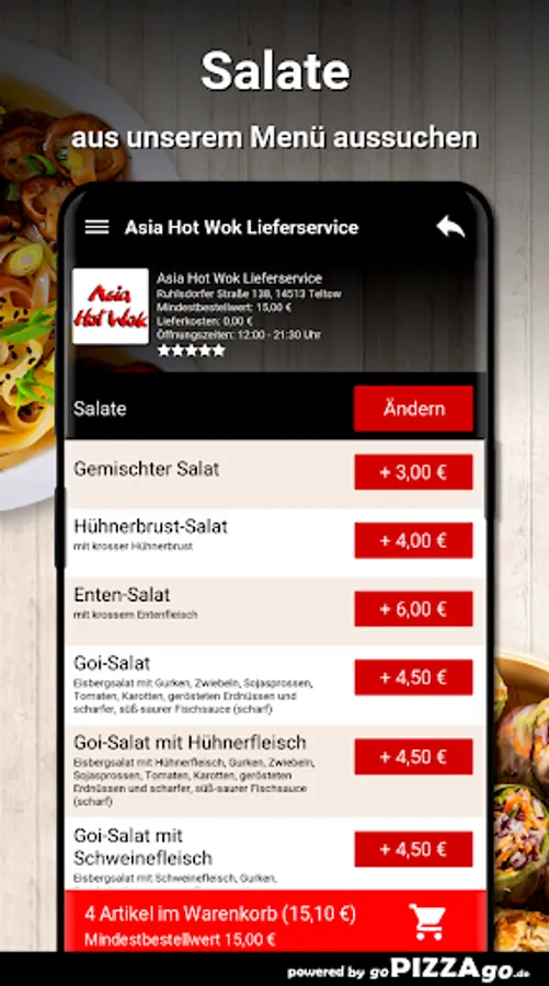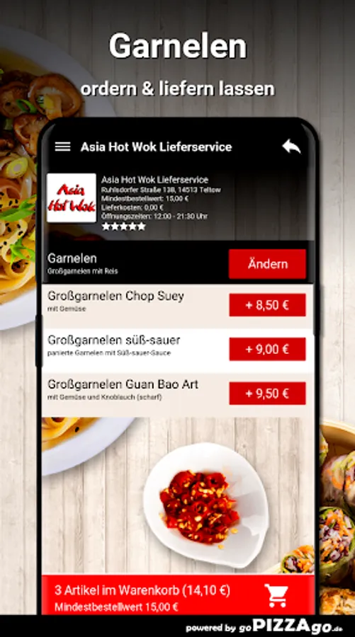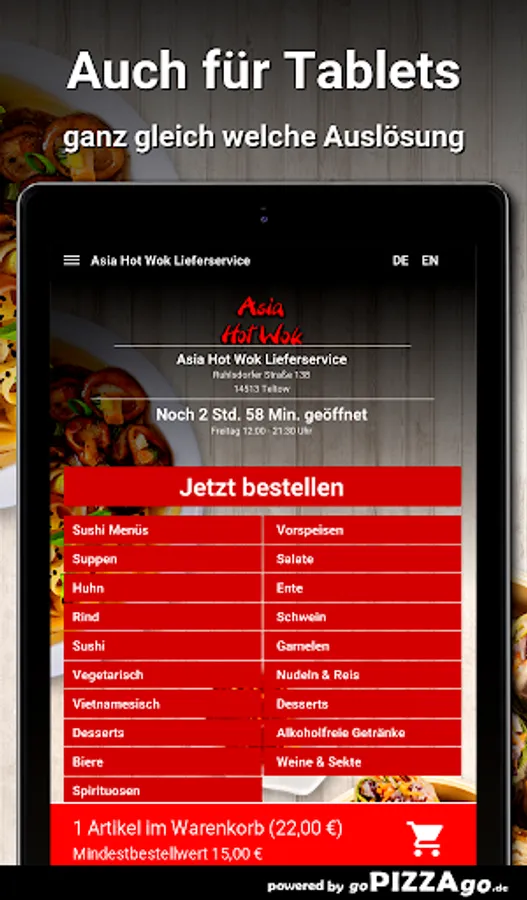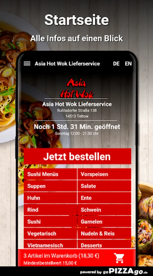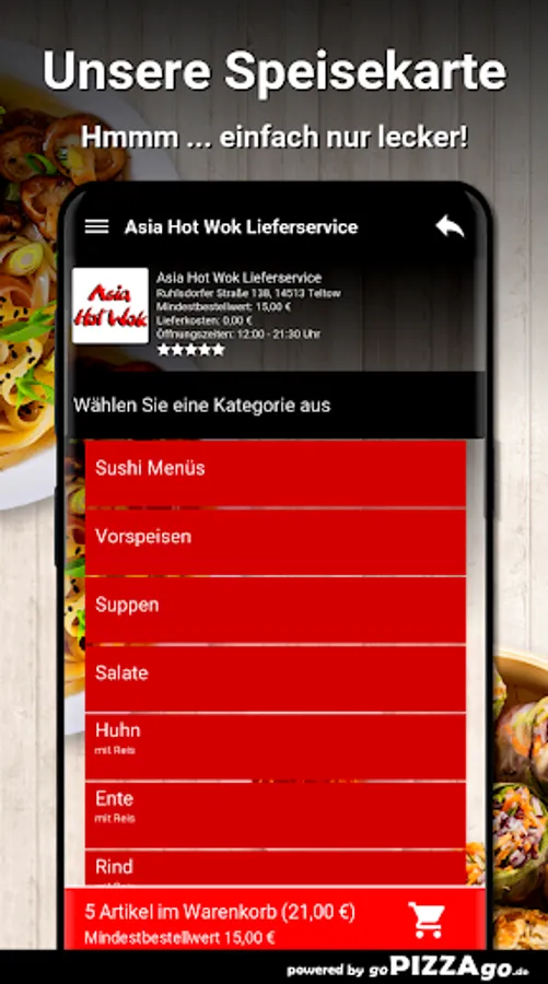 You can easily order numerous meals online from the Asia Hot Wok Delivery Service (Ruhlsdorfer Straße 138 in Teltow). With us you have the choice between 172 delicacies such as fried noodles and prawns for € 8.80 or sushi menu 5 for € 12.80. After feasting, you can enjoy a dessert like Baked Apple, Baked Banana, Baked Pineapple. The seven most delicious dishes The delivery times of Asia Hot Wok delivery service