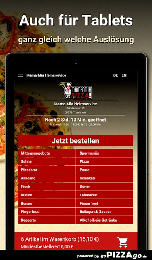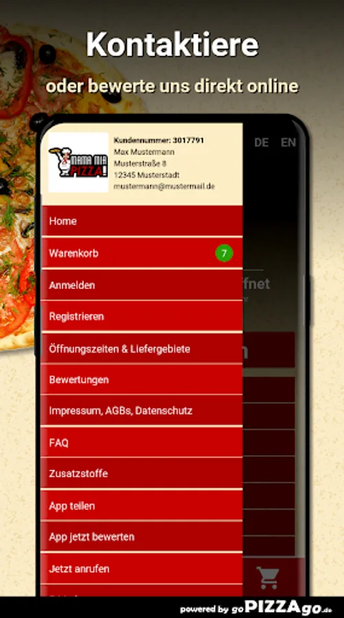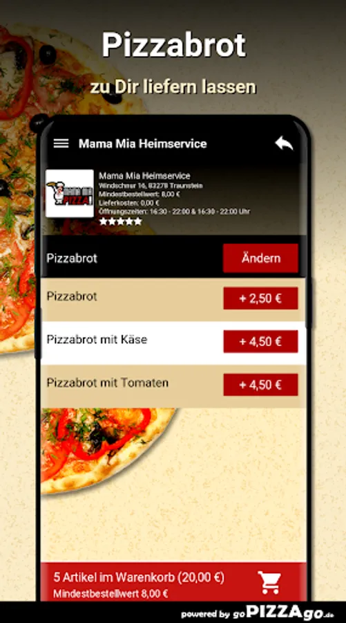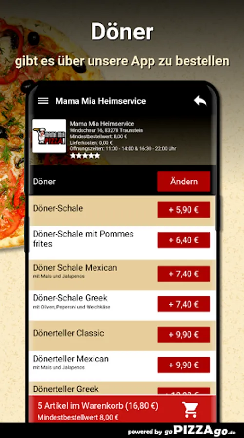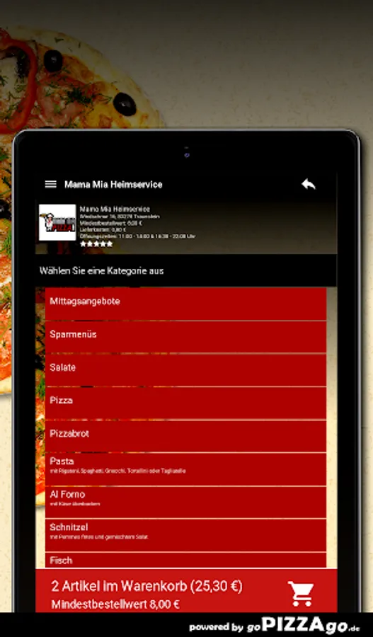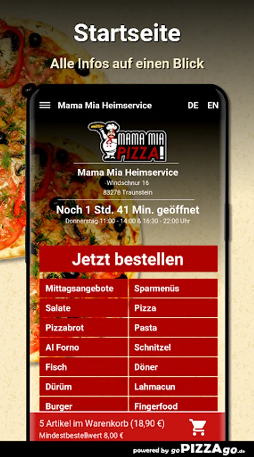 You can order hearty delicacies from us and have them delivered to your office or home. We offer 131 fresh dishes (Pizza Calzone, Pizza Spinaci, Pizza Quattro Stagioni). Mama Mia Heimservice also offers you affordable lunch options such as pasta, pizza.The top 7 hits with usThe delivery times of Mama Mia Heimservice