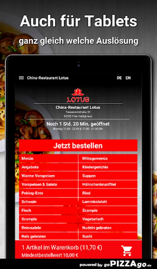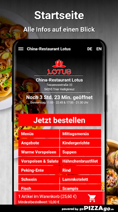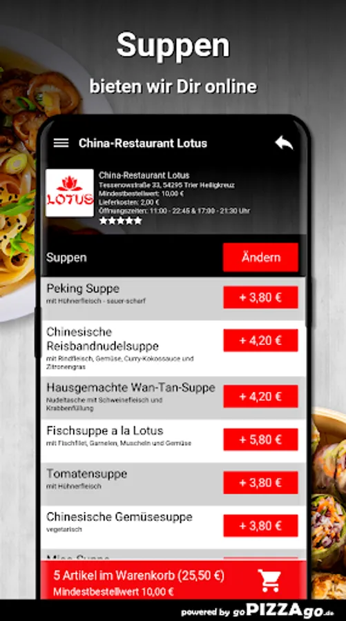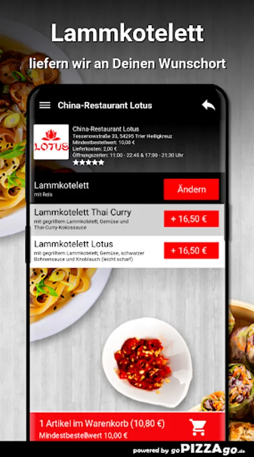 China-Restaurant Lotus - Your delivery service in Trier Heiligkreuz At China-Restaurant Lotus you can order lamb chops, rice noodles, soups, chicken breast fillet, fried noodles, beef, warm starters and sushi to order online.