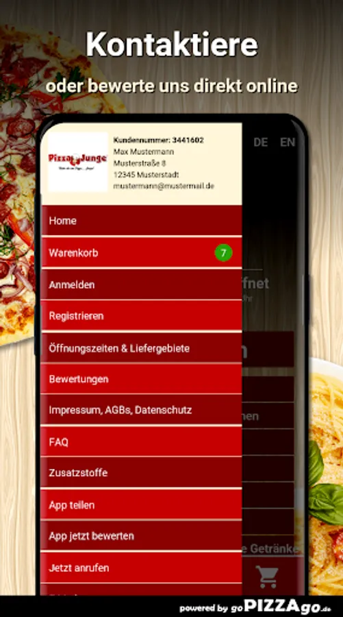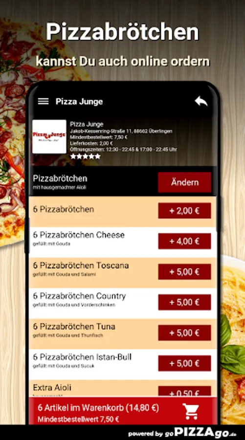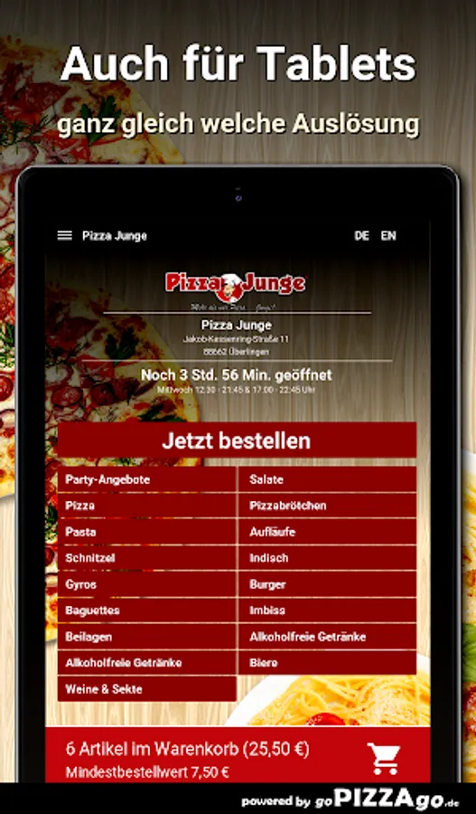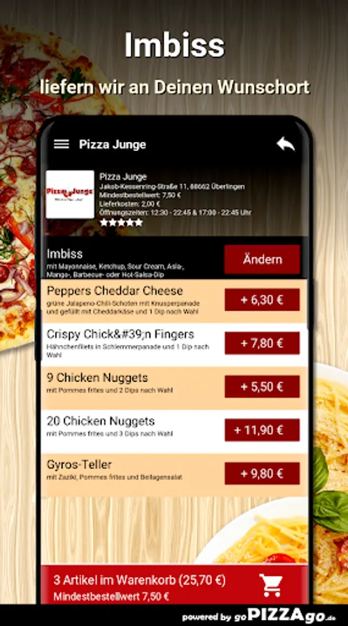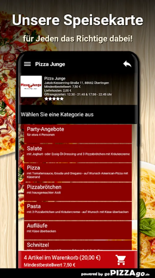 Order food online at Pizza Junge Überlingen At Pizza Junge you can order pizza, pasta, pizza rolls, burgers, Indian, baguettes here and have them delivered.