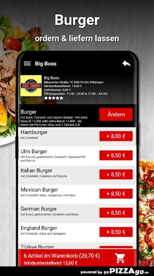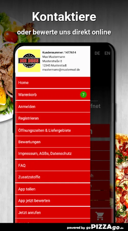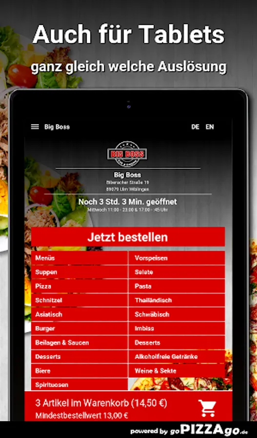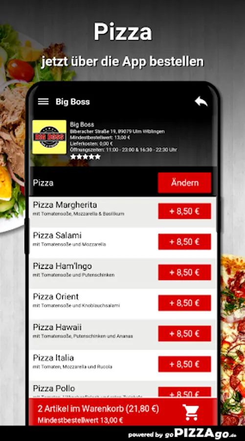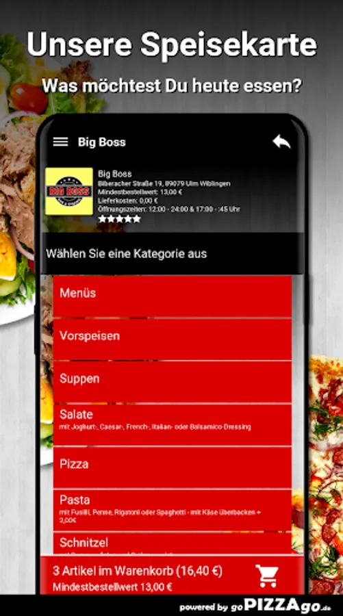 Welcome to our Pizza Service Big Boss Would you like pizza, Asian, salads, starters, soups, snacks to order and have them delivered?