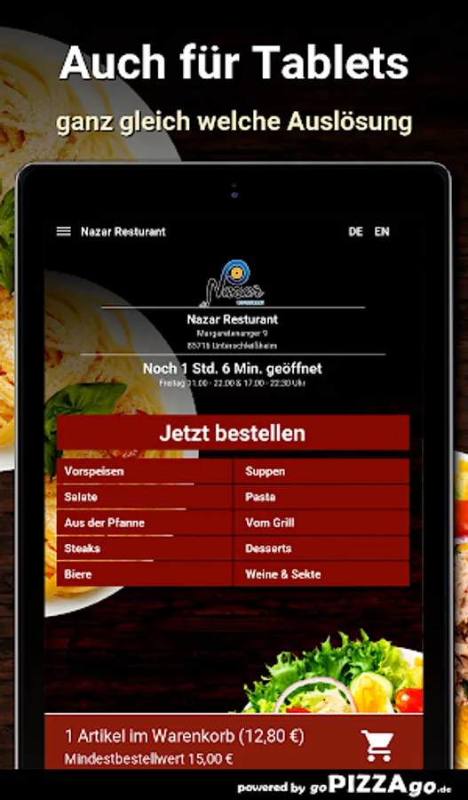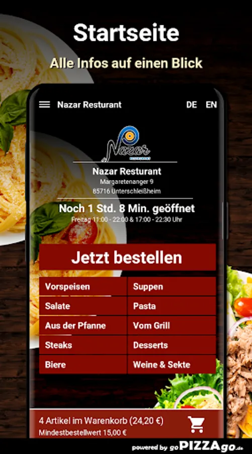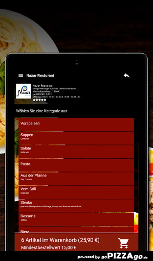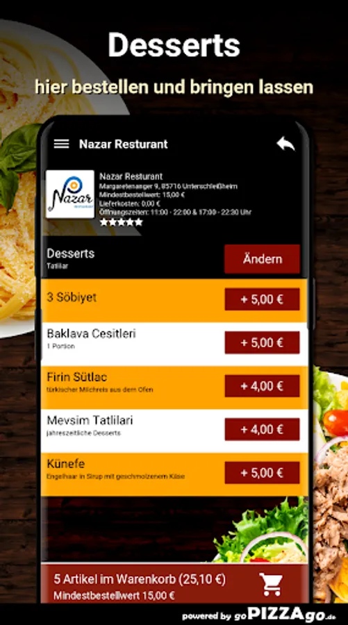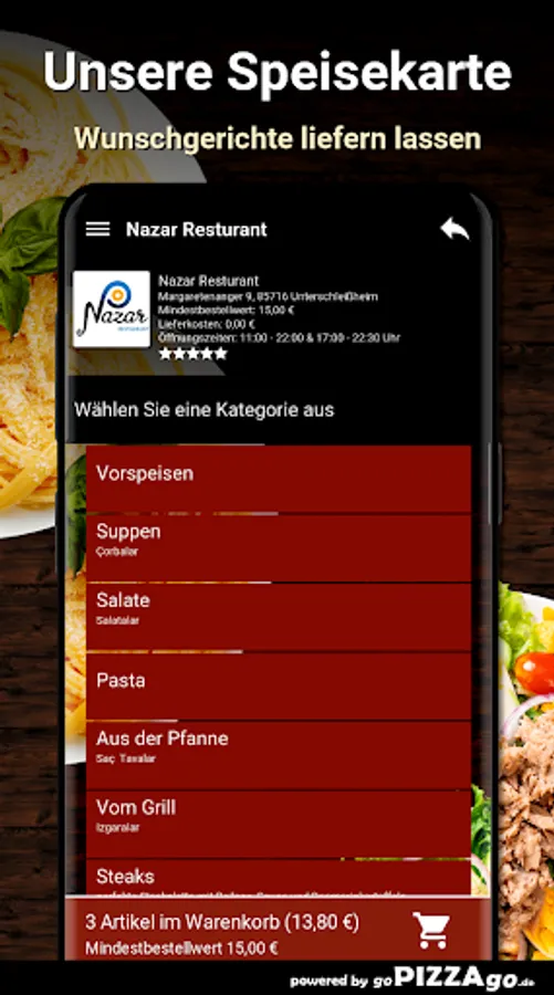 You can quickly order pasta delicious Italian pasta at Nazar Restaurant. With us you can also enjoy 3 different pasta dishes which also taste totally fresh and aromatic. You can get Penne Veggie delivered to your place of residence for € 8.90, Chicken Penne for € 9.90, and deliciously seasoned Arabian Penne for € 10.50. Nazar Restaurant wishes you bon appétit