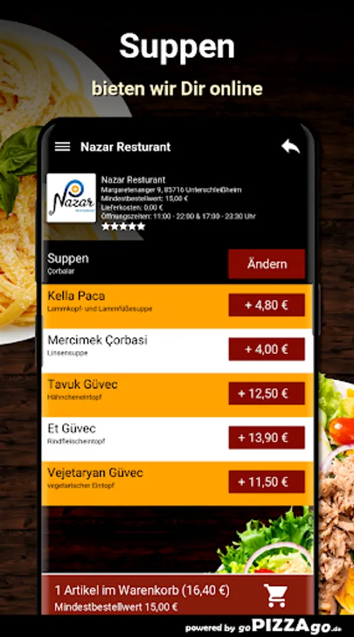 You can safely order from a large selection of dishes at the Heimservice Nazar Restaurant (85716 Unterschleißheim) & have them delivered to your home or perhaps your office. You will find 65 dishes in our online menu, including Antrikot - Beef, Yaprak Sarmasi, Tavuk Salatasi, Potato Slice, Penne Veggie, Adana Kebap or perhaps Ali Nazik Kebap for € 14.50. What are our top sellers? When we deliver your food