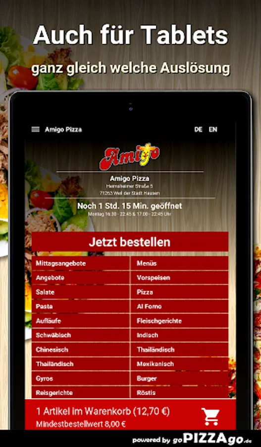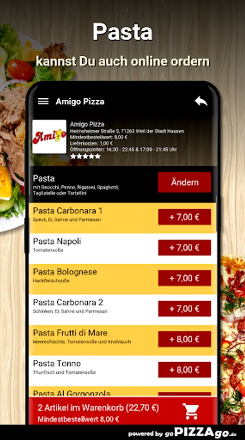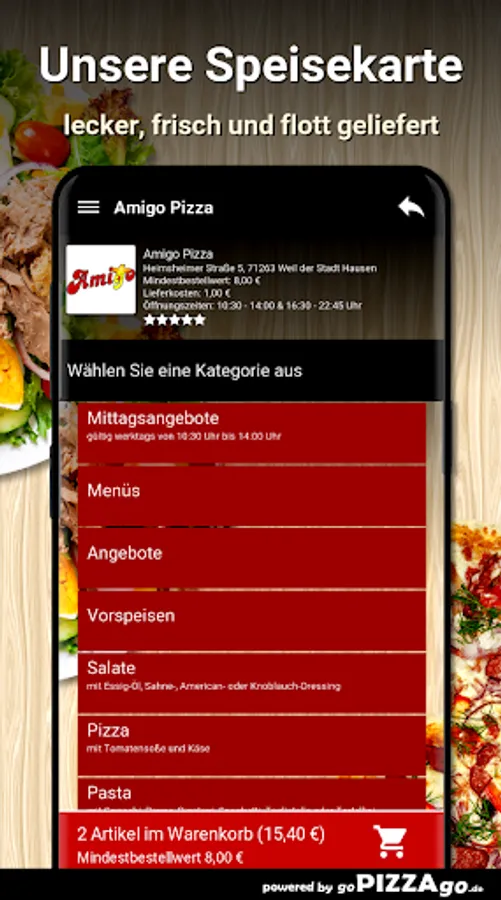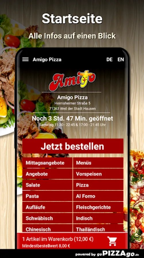 Of course, you can order and pay for a wide range of dishes from our Amigo Pizza delivery service in Weil der Stadt Hausen in our online shop. Choose from our menu from 299 dishes & drinks such as Pizza Texas, Pizza Seafood Garlic, Panäng-Muh, Beef Shi Zau. We also have lunches such as small pizza lunches, pasta lunches, large pizza lunches, family pizza lunches, party pizza lunches at really low prices.
